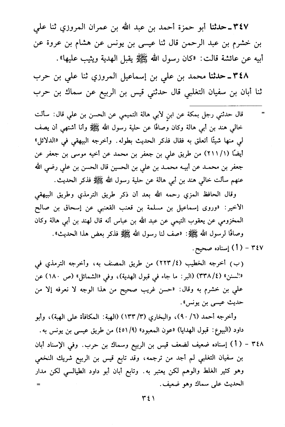 347 - حَدَّثَنَا أَبُو حَمْزَةَ أَحْمَدُ بْنُ عَبْدِ اللَّهِ بْنِ عِمْرَانَ الْمَرْوَزِيُّ، ثنا عَلِيُّ بْنُ خَشْرَمِ بْنِ عَبْدِ الرَّحْمَنِ قَالَ: ثنا عِيسَى بْنُ يُونُسَ، عَنْ هِشَامِ بْنِ عُرْوَةَ، عَنْ أَبِيهِ، عَنْ عَائِشَةَ قَالَتْ: «كَانَ رَسُولُ اللَّهِ صَلَّى اللهُ عَلَيْهِ وَسَلَّمَ يَقْبَلُ الْهَدِيَّةَ وَيُثِيبُ عَلَيْهَا»