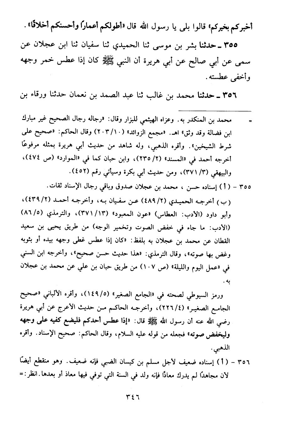 355 - حَدَّثَنَا بِشْرُ بْنُ مُوسَى، ثنا الْحُمَيْدِيُّ، ثنا سُفْيَانُ، ثنا ابْنُ عَجْلَانَ، عَنْ سُمَيٍّ، عَنْ أَبِي صَالِحٍ، عَنْ أَبِي هُرَيْرَةَ، «أَنَّ النَّبِيَّ صَلَّى اللهُ عَلَيْهِ وَسَلَّمَ كَانَ إِذَا عَطَسَ خَمَّرَ وَجْهَهُ وَأَخْفَى عَطْسَتَهُ»