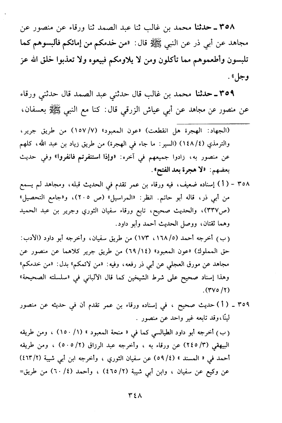 358 - حَدَّثَنَا مُحَمَّدُ بْنُ غَالِبٍ، ثنا عَبْدُ الصَّمَدِ، ثنا وَرْقَاءُ، عَنْ مَنْصُورٍ، عَنْ مُجَاهِدٍ، عَنْ أَبِي ذَرٍّ، عَنِ النَّبِيِّ صَلَّى اللَّهُ عَلَيْهِ قَالَ: «مَنْ خَدَمَكُمْ مِنْ إِمَائِكُمْ فَأَلْبَسُوهُمْ كَمَا تَلْبَسُونَ، وَأَطْعِمُوهُمْ مِمَّا تَأْكُلُونَ، وَمَنْ لَا يُلَاوِمُكُمْ فَبِيعُوهُ وَلَا تُعَذِّبُوا خَلْقَ اللَّهِ عَزَّ وَجَلَّ»