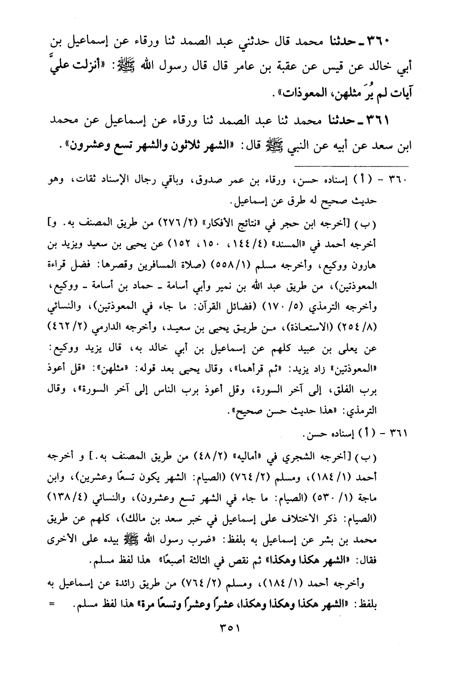 361 - حَدَّثَنَا مُحَمَّدٌ، ثنا عَبْدُ الصَّمَدِ، ثنا وَرْقَاءُ، عَنْ إِسْمَاعِيلَ، عَنْ مُحَمَّدِ بْنِ سَعْدٍ، عَنْ أَبِيهِ، عَنِ النَّبِيِّ صَلَّى اللهُ عَلَيْهِ وَسَلَّمَ قَالَ: «الشَّهْرُ ثَلَاثُونَ وَالشَّهْرُ تِسْعٌ وَعِشْرُونَ»