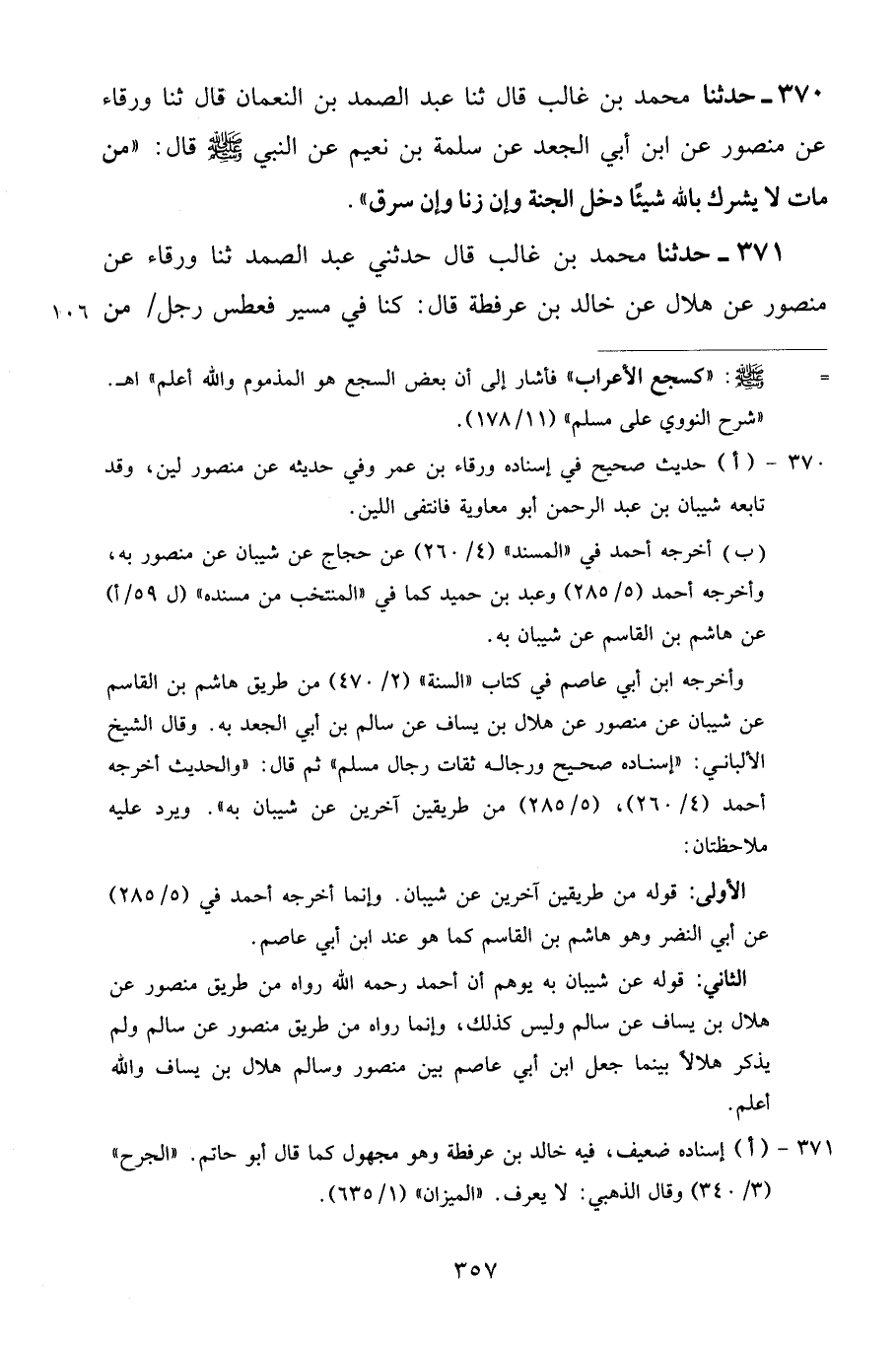 370 - حَدَّثَنَا مُحَمَّدُ بْنُ غَالِبٍ قَالَ: ثنا عَبْدُ الصَّمَدِ بْنُ النُّعْمَانِ قَالَ: ثنا وَرْقَاءُ، عَنْ مَنْصُورٍ، عَنِ ابْنِ أَبِي الْجَعْدِ، عَنْ سَلَمَةَ بْنِ نُعَيْمٍ، عَنِ النَّبِيِّ صَلَّى اللهُ عَلَيْهِ وَسَلَّمَ، قَالَ: «مَنْ مَاتَ لَا يُشْرِكُ بِاللَّهِ شَيْئًا دَخَلَ الْجَنَّةَ وَإِنْ زَنَى وَإِنْ سَرَقَ»