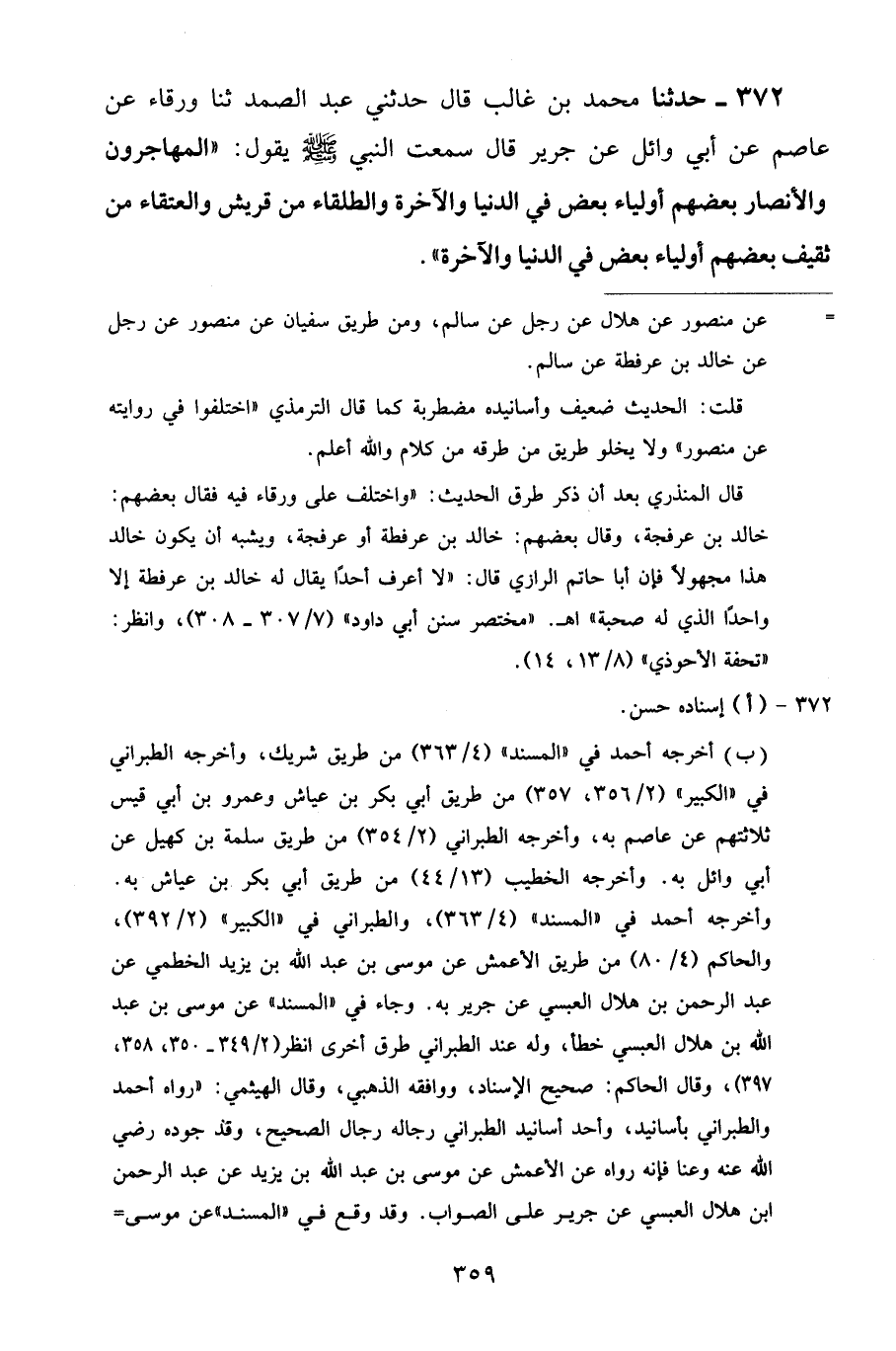 372 - حَدَّثَنَا مُحَمَّدُ بْنُ غَالِبٍ قَالَ: حَدَّثَنِي عَبْدُ الصَّمَدِ، ثنا وَرْقَاءُ، عَنْ عَاصِمٍ، عَنْ أَبِي وَائِلٍ، عَنْ جَرِيرٍ قَالَ: سَمِعْتُ النَّبِيَّ صَلَّى اللهُ عَلَيْهِ وَسَلَّمَ يَقُولُ: «الْمُهَاجِرُونَ وَالْأَنْصَارُ بَعْضُهُمْ أَوْلِيَاءُ بَعْضٍ فِي الدُّنْيَا وَالطُّلَقَاءُ مِنْ قُرَيْشٍ، وَالْعُتَقَاءُ مِنْ ثَقِيفٍ بَعْضُهُمْ أَوْلِيَاءُ بَعْضٍ فِي الدُّنْيَا وَالْآخِرَةِ»