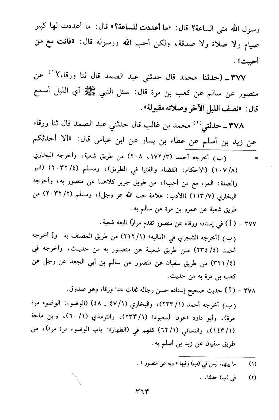 377 - حَدَّثَنَا مُحَمَّدٌ قَالَ: حَدَّثَنِي عَبْدُ الصَّمَدِ قَالَ: ثنا وَرْقَاءُ، عَنْ مَنْصُورٍ، عَنْ سَالِمٍ، عَنْ كَعْبِ بْنِ مُرَّةَ قَالَ: سُئِلَ النَّبِيُّ صَلَّى اللهُ عَلَيْهِ وَسَلَّمَ أَيُّ اللَّيْلِ أَسْمَعُ؟ قَالَ: «نِصْفُ اللَّيْلِ الْآخَرُ وَصَلَاتُهُ مَقْبُولَةٌ»