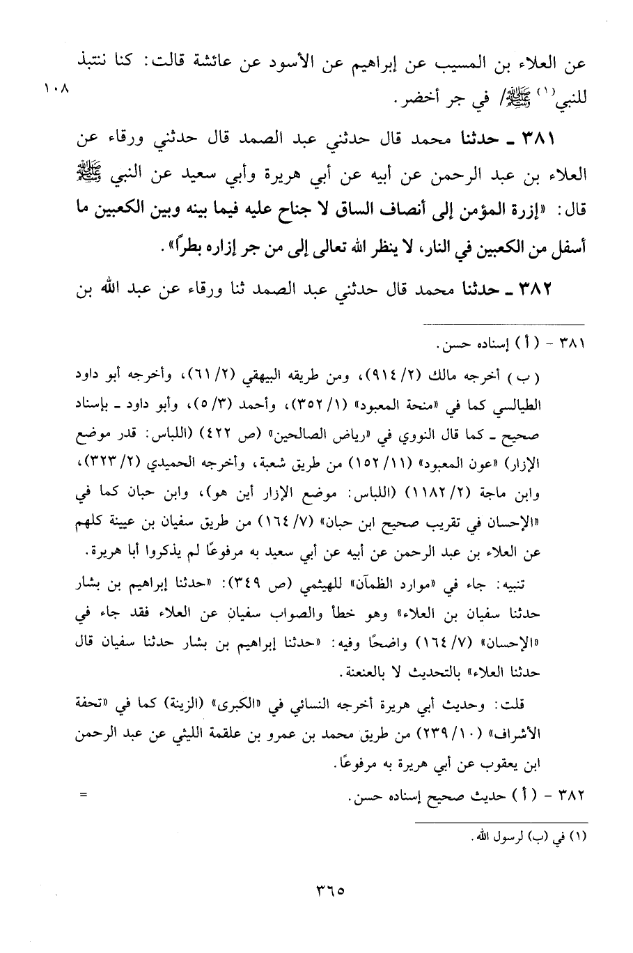 381 - حَدَّثَنَا مُحَمَّدٌ قَالَ: حَدَّثَنِي عَبْدُ الصَّمَدِ، حَدَّثَنِي وَرْقَاءُ، عَنِ الْعَلَاءِ بْنِ عَبْدِ الرَّحْمَنِ، عَنْ أَبِيهِ، عَنْ أَبِي هُرَيْرَةَ، وَأَبِي سَعِيدٍ عَنِ النَّبِيِّ صَلَّى اللهُ عَلَيْهِ وَسَلَّمَ، قَالَ: «إِزْرَةُ الْمُؤْمِنِ إِلَى أَنْصَافِ السَّاقِ لَا جُنَاحَ عَلَيْهِ فِيمَا بَيْنَهُ وَبَيْنَ الْكَعْبَيْنِ، مَا أَسْفَلَ مِنَ الْكَعْبَيْنِ فِي النَّارِ، لَا يَنْظُرُ اللَّهُ تَعَالَى إِلَى مَنْ جَرَّ إِزَارَهُ بَطَرًا»