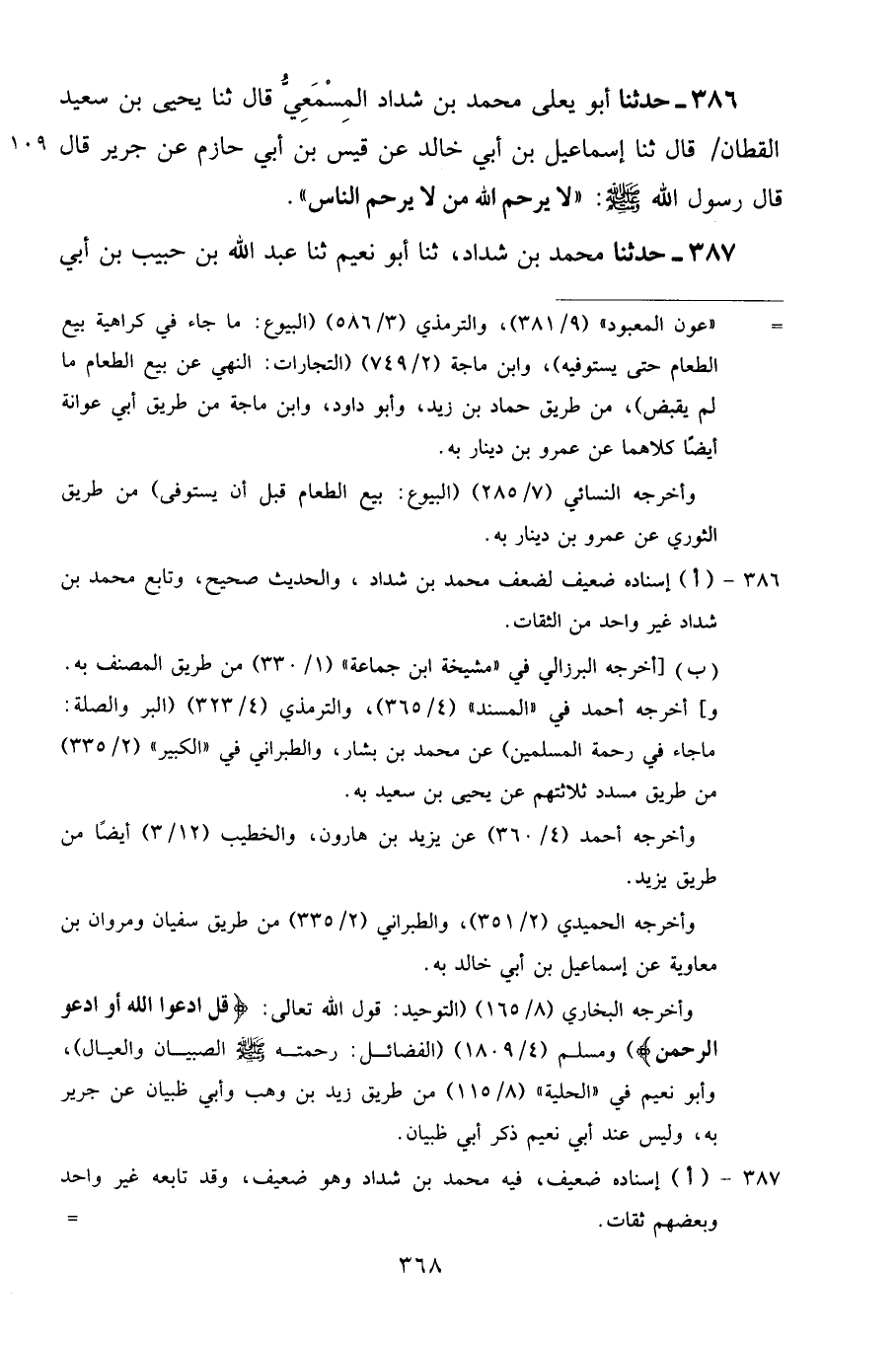 386 - حَدَّثَنَا أَبُو يَعْلَى مُحَمَّدُ بْنُ شَدَّادٍ الْمِسْمَعِيُّ، قَالَ: ثنا يَحْيَى بْنُ سَعِيدٍ الْقَطَّانُ قَالَ: ثنا إِسْمَاعِيلُ بْنُ أَبِي خَالِدٍ، عَنْ قَيْسِ بْنِ أَبِي حَازِمٍ، عَنْ جَرِيرٍ قَالَ: قَالَ رَسُولُ اللَّهِ صَلَّى اللهُ عَلَيْهِ وَسَلَّمَ: «لَا يَرْحَمُ اللَّهُ مَنْ لَا يَرْحَمُ النَّاسَ»