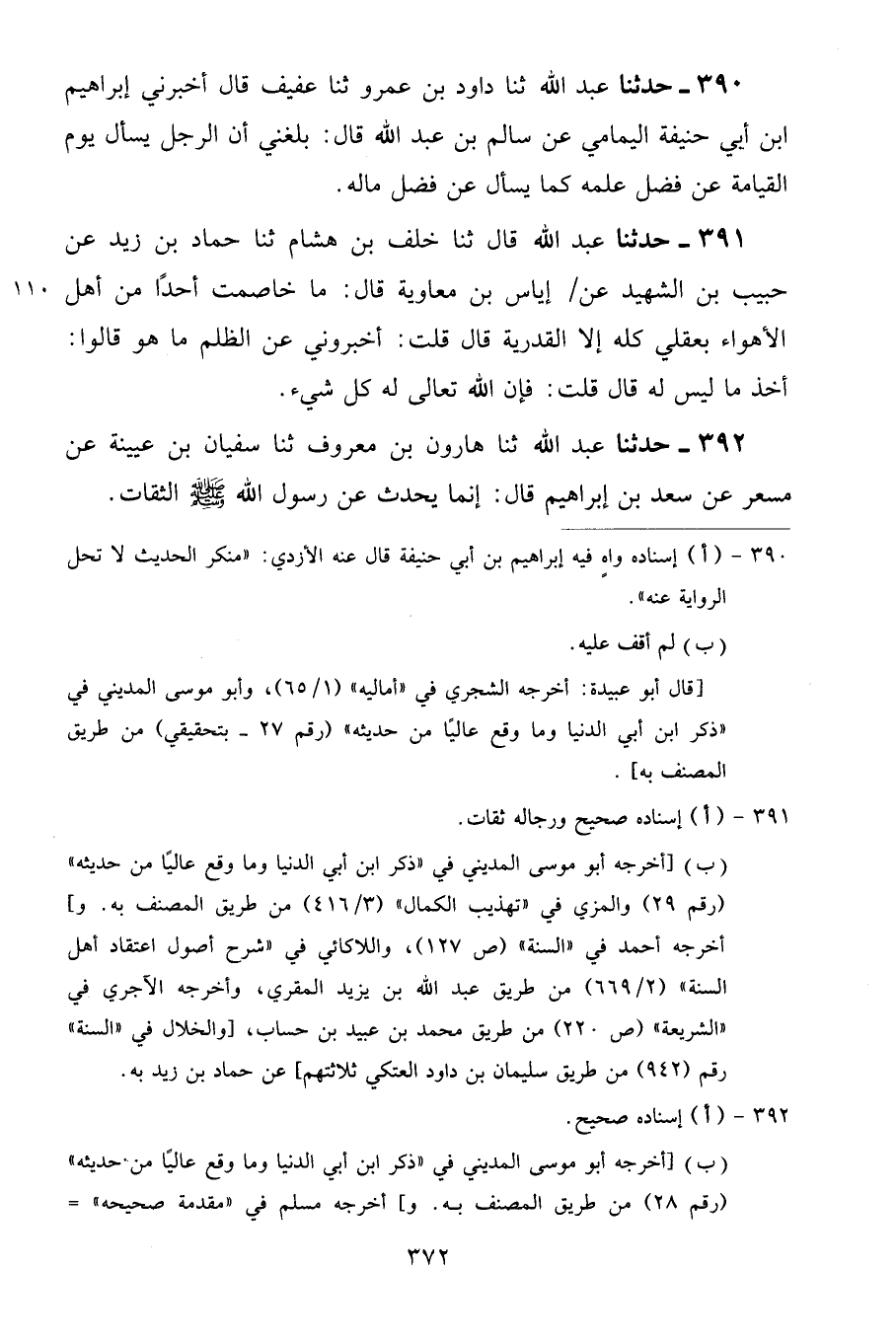 390 - حَدَّثَنَا عَبْدُ اللَّهِ، ثنا دَاوُدُ بْنُ عَمْرٍو، ثنا عَفِيفٌ قَالَ: أَخْبَرَنِي إِبْرَاهِيمُ بْنُ أَبِي حَنِيفَةَ الْيَمَامِيُّ، عَنْ سَالِمِ بْنِ عَبْدِ اللَّهِ قَالَ: «بَلَغَنِي أَنَّ الرَّجُلَ يُسْأَلُ يَوْمَ الْقِيَامَةِ، عَنْ فَضْلِ عِلْمِهِ كَمَا يُسْأَلُ عَنْ فَضْلِ مَالِهِ»