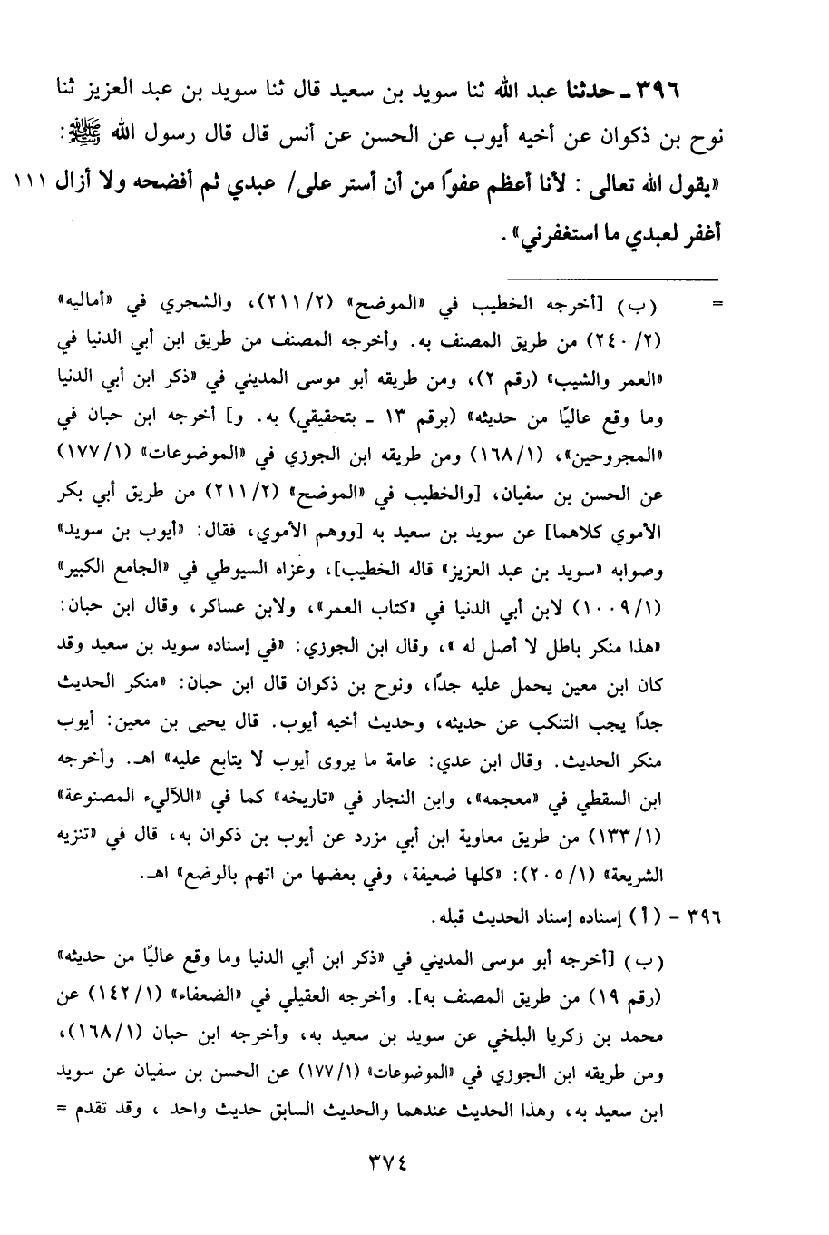 396 - حَدَّثَنَا عَبْدُ اللَّهِ، ثنا سُوَيْدُ بْنُ سَعِيدٍ قَالَ: ثنا سُوَيْدُ بْنُ عَبْدِ الْعَزِيزِ، ثنا نُوحُ بْنُ ذَكْوَانَ، عَنْ أَخِيهِ أَيُّوبَ، عَنِ الْحَسَنِ، عَنْ أَنَسٍ قَالَ: قَالَ رَسُولُ اللَّهِ صَلَّى اللهُ عَلَيْهِ وَسَلَّمَ: " يَقُولُ اللَّهُ تَعَالَى: لَأَنَا أَعْظَمُ عَفُوًّا مِنْ أَنْ أَسْتُرُ عَلَى عَبْدِي ثُمَّ أَفْضَحَهُ وَلَا أَزَالُ أَغْفِرُ لِعَبْدِي مَا اسْتَغْفَرَنِي "