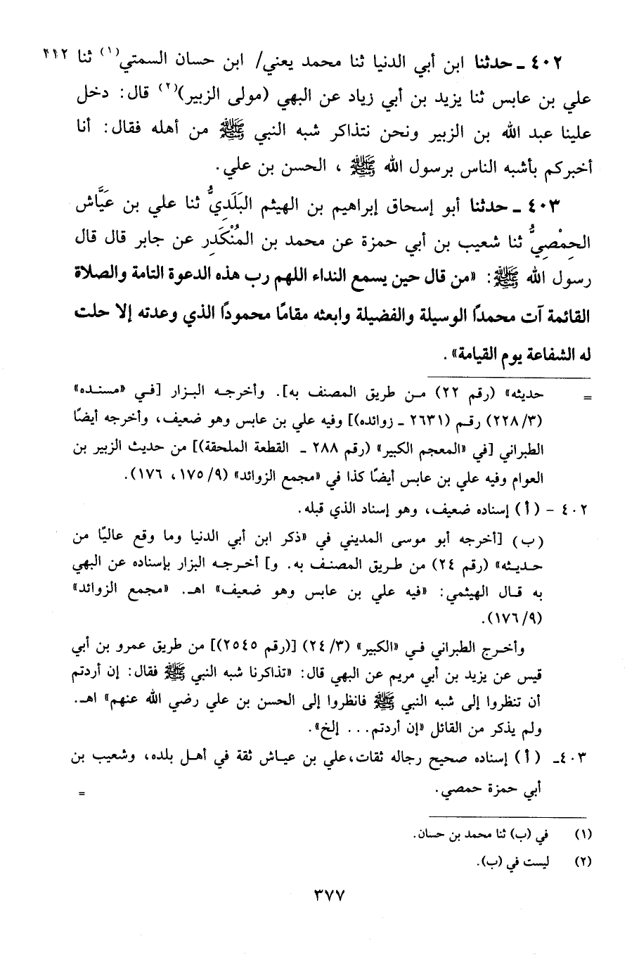 402 - حَدَّثَنَا ابْنُ أَبِي الدُّنْيَا، ثنا مُحَمَّدٌ يَعْنِي ابْنَ حَسَّانَ السَّمْتِيَّ، ثنا عَلِيُّ بْنُ عَابِسٍ، ثنا يَزِيدُ بْنُ أَبِي زِيَادٍ، عَنِ الْبَهِيِّ، مَوْلَى الزُّبَيْرِ، قَالَ: دَخَلَ عَلَيْنَا عَبْدُ اللَّهِ بْنُ الزُّبَيْرِ، وَنَحْنُ نَتَذَاكَرُ شَبَهُ النَّبِيُّ صَلَّى اللهُ عَلَيْهِ وَسَلَّمَ مِنْ أَهْلِهِ، فَقَالَ: «أَنَا أُخْبِرُكُمْ بِأَشْبَهِ النَّاسِ بِرَسُولِ اللَّهِ صَلَّى اللهُ عَلَيْهِ وَسَلَّمَ، الْحَسَنُ بْنُ عَلِيٍّ»