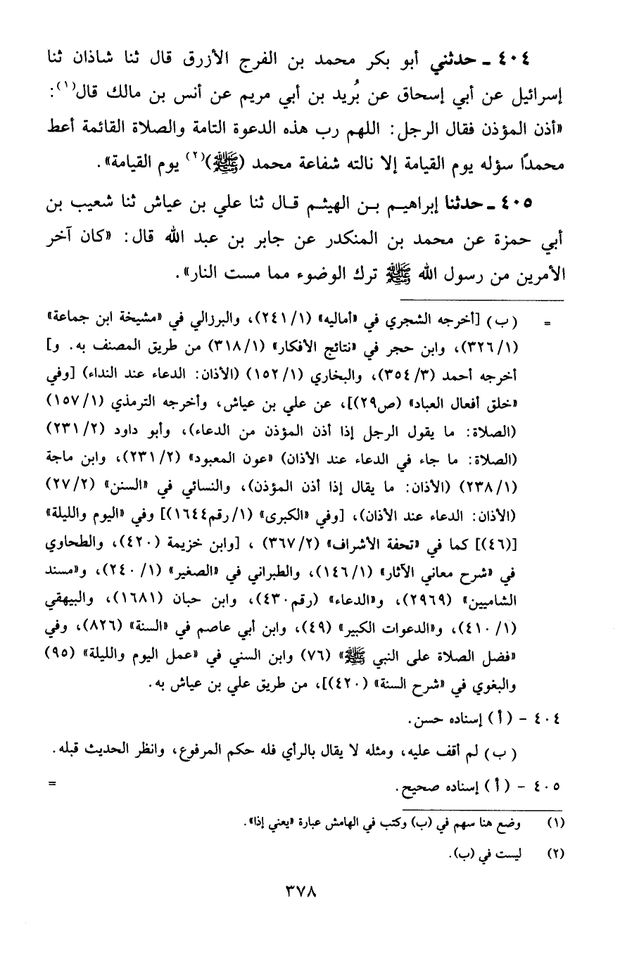 404 - حَدَّثَنِي أَبُو بَكْرٍ مُحَمَّدُ بْنُ الْفَرَجِ الْأَزْرَقُ، قَالَ: ثنا شَاذَانُ ثنا إِسْرَائِيلُ عَنْ أَبِي إِسْحَاقَ عَنْ بُرَيْدِ بْنِ أَبِي مَرْيَمَ عَنْ أَنَسِ بْنِ مَالِكٍ قَالَ: إِذَا أَذَّنَ الْمُؤَذِّنُ فَقَالَ الرَّجُلُ: «اللَّهُمَّ رَبَّ هَذِهِ الدَّعْوَةِ التَّامَّةِ وَالصَّلَاةِ الْقَائِمَةِ أَعْطِ مُحَمَّدًا سُؤْلَهُ يَوْمَ الْقِيَامَةِ إِلَّا نَالَتْهُ شَفَاعَةُ مُحَمَّدٍ صَلَّى اللهُ عَلَيْهِ وَسَلَّمَ يَوْمَ الْقِيَامَةِ»