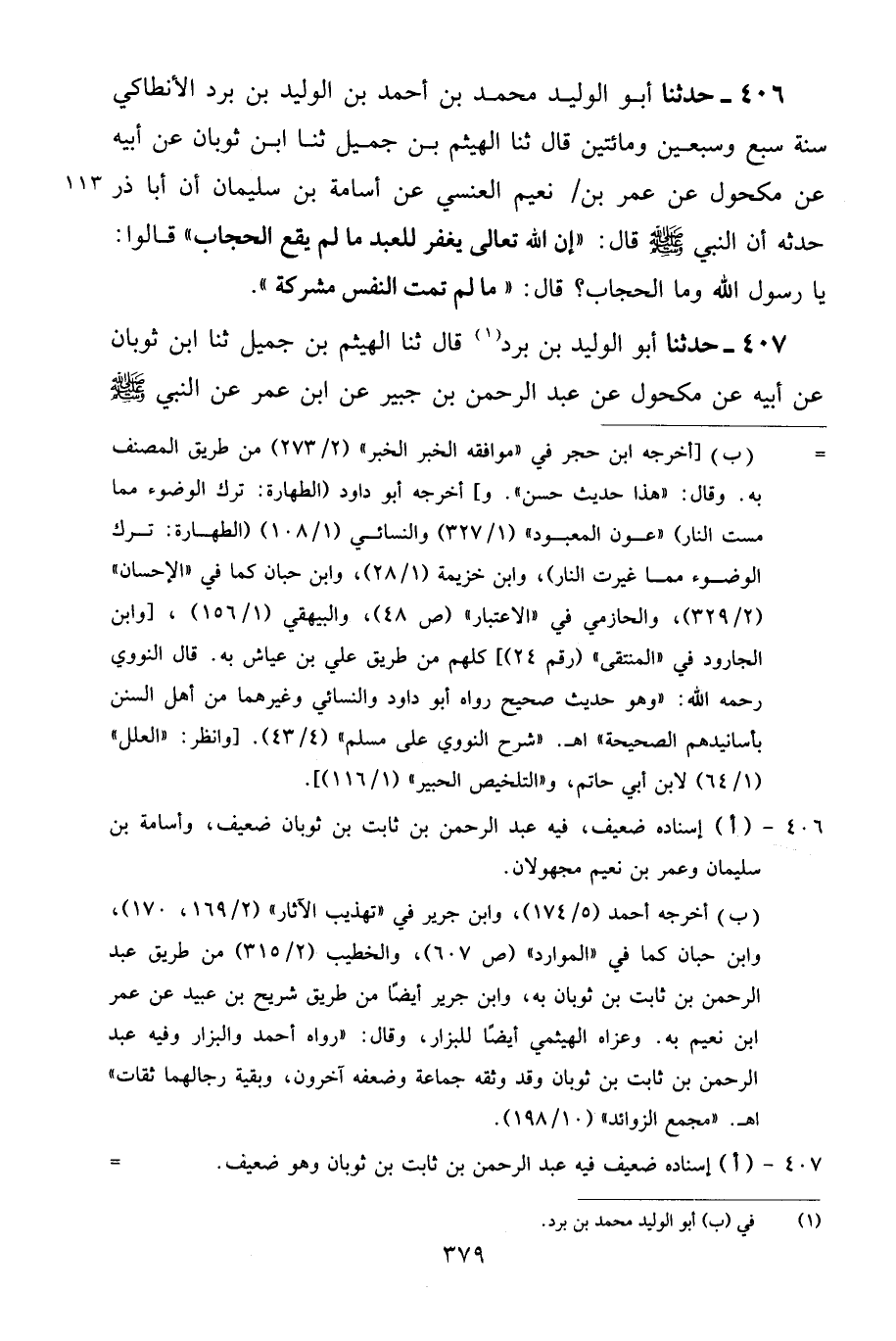406 - حَدَّثَنَا أَبُو الْوَلِيدِ مُحَمَّدُ بْنُ أَحْمَدَ بْنِ الْوَلِيدِ بْنِ بُرْدٍ الْأَنْطَاكِيُّ سَنَةَ سَبْعٍ وَسَبْعِينَ وَمِائَتَيْنِ، قَالَ: ثنا الْهَيْثَمُ بْنُ جَمِيلٍ، ثنا ابْنُ ثَوْبَانَ، عَنْ أَبِيهِ، عَنْ مَكْحُولٍ، عَنْ عُمَرَ بْنِ نُعَيْمٍ الْعَنْسِيِّ، عَنْ أُسَامَةَ بْنِ سَلْمَانَ أَنَّ أَبَا ذَرٍّ حَدَّثَهُ أَنَّ النَّبِيَّ صَلَّى اللهُ عَلَيْهِ وَسَلَّمَ قَالَ: «إِنَّ اللَّهَ تَعَالَى يَغْفِرُ لِلْعَبْدِ مَا لَمْ يَقَعِ الْحِجَابُ» قَالُوا: يَا رَسُولَ اللَّهِ وَمَا الْحِجَابُ؟ قَالَ: «مَا لَمْ تَمُتِ النَّفْسُ مُشْرِكَةً»