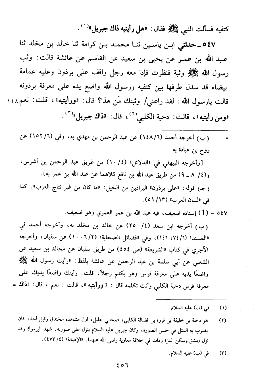 547 - حَدَّثَنِي ابْنُ يَاسِينَ، ثنا مُحَمَّدُ بْنُ كَرَامَةَ، ثنا خَالِدُ بْنُ مَخْلَدٍ، ثنا عَبْدُ اللَّهِ بْنُ عُمَرَ، عَنْ يَحْيَى بْنِ سَعِيدٍ، عَنِ الْقَاسِمِ، عَنْ عَائِشَةَ قَالَتْ: " وَثَبَ رَسُولُ اللَّهِ صَلَّى اللهُ عَلَيْهِ وَسَلَّمَ وَثْبَةً فَنَظَرْتٌ فَإِذَا مَعَهُ رَجُلٌ وَاقِفٌ عَلَى بِرْذَوْنٍ وَعَلَيْهِ عِمَامَةٌ بَيْضَاءُ قَدْ سَدَلَ طَرْفَهَا بَيْنَ كَتِفَيْهِ، وَرَسُولُ اللَّهِ وَاضِعٌ يَدَهُ عَلَى مِعْرَفَةِ بِرْذَوْنِهِ قَالَتْ: يَا رَسُولَ اللَّهِ: لَقَدْ رَاعَنِي وَثْبَتُكَ مِنْ هَذَا؟ قَالَ: «وَرَأَيْتِيهِ» قُلْتُ: نَعَمْ «وَمَنْ رَأَيْتِيهِ» قَالَتْ: دِحْيَةُ الْكَلْبِيُّ، قَالَ: «ذَاكَ جِبْرِيلُ»