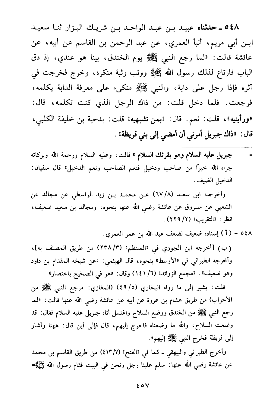 548 - حَدَّثَنَاهُ عُبَيْدُ بْنُ عَبْدِ الْوَاحِدِ بْنِ شَرِيكٍ الْبَزَّارُ، ثنا سَعِيدُ بْنُ أَبِي مَرْيَمَ، أَنْبَأَ الْعُمَرِيُّ، عَنْ عَبْدِ الرَّحْمَنِ بْنِ الْقَاسِمِ، عَنْ أَبِيهِ، عَنْ عَائِشَةَ، قَالَتْ: " لَمَّا رَجَعَ النَّبِيُّ صَلَّى اللهُ عَلَيْهِ وَسَلَّمَ يَوْمَ الْخَنْدَقِ، بَيْنَا هُوَ عِنْدِي، إِذْ دَقَّ الْبَابُ فَارْتَاعَ لِذَلِكَ رَسُولُ اللَّهِ صَلَّى اللهُ عَلَيْهِ وَسَلَّمَ وَوَثَبَ وَثْبَةً مُنْكَرَةً، وَخَرَجَ، فَخَرَجْتُ فِي أَثَرِهِ فَإِذَا رَجُلٌ عَلَى دَابَّةٍ، وَالنَّبِيُّ صَلَّى اللهُ عَلَيْهِ وَسَلَّمَ مُتَّكِئٌ عَلَى مِعْرَفَةِ الدَّابَّةِ يُكَلِّمُهُ، فَرَجَعْتُ. فَلَمَّا دَخَلَ قُلْتُ: مَنْ ذَاكَ الرَّجُلُ الَّذِي كُنْتَ تُكَلِّمُهُ، قَالَ: «وَرَأَيْتِيهِ»؟ قُلْتُ: نَعَمْ. قَالَ: «بِمَنْ تُشَبِّهِيهِ؟» قُلْتُ: بِدِحْيَةَ بْنِ خَلِيفَةَ الْكَلْبِيِّ، قَالَ: «ذَاكَ جِبْرِيلُ أَمَرَنِي أَنْ أَمْضِيَ إِلَى بَنِي قُرَيْظَةَ» -[458]- حَدِيثٌ حَادِيَ عَشَرَ