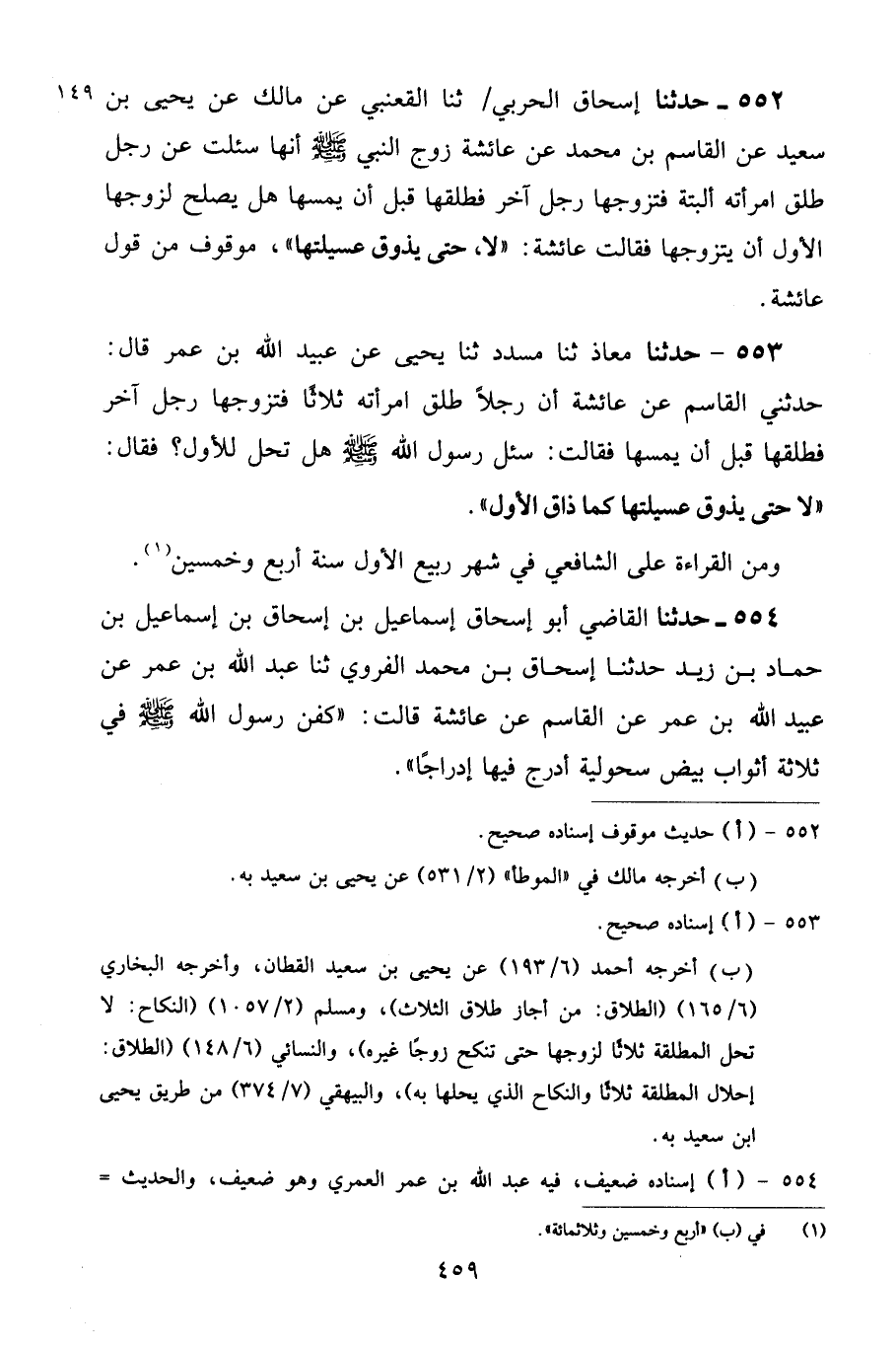 552 - حَدَّثَنَا إِسْحَاقُ الْحَرْبِيُّ، ثنا الْقَعْنَبِيُّ، عَنْ مَالِكٍ، عَنْ يَحْيَى بْنِ سَعِيدٍ، عَنِ الْقَاسِمِ بْنِ مُحَمَّدٍ، عَنْ عَائِشَةَ، زَوْجِ النَّبِيِّ صَلَّى اللهُ عَلَيْهِ وَسَلَّمَ أَنَّهَا سُئِلَتْ عَنْ رَجُلٍ طَلَّقَ امْرَأَتَهُ أَلْبَتَّةَ فَتَزَوَّجَهَا رَجُلٌ آخَرُ فَطَلَّقَهَا قَبْلَ أَنْ يَمَسَّهَا هَلْ يَصْلُحُ لِزَوْجِهَا الْأَوَّلِ أَنْ يَتَزَوَّجَهَا؟ فَقَالَتْ عَائِشَةُ: «لَا، حَتَّى يَذُوقَ عُسَيْلَتَهَا» مَوْقُوفٌ مِنْ قَوْلِ عَائِشَةَ