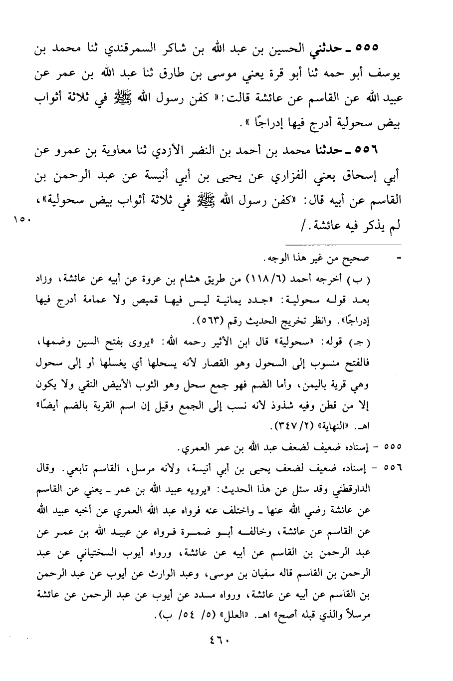 556 - حَدَّثَنَا مُحَمَّدُ بْنُ أَحْمَدَ بْنِ النَّضْرِ الْأَزْدِيُّ، ثنا مُعَاوِيَةُ بْنُ عَمْرٍو، عَنْ أَبِي إِسْحَاقَ يَعْنِي الْفَزَارِيَّ، عَنْ يَحْيَى بْنِ أَبِي أُنَيْسَةَ، عَنْ عَبْدِ الرَّحْمَنِ بْنِ الْقَاسِمِ، عَنْ أَبِيهِ قَالَ: «كُفِّنَ رَسُولُ اللَّهِ صَلَّى اللهُ عَلَيْهِ وَسَلَّمَ فِي ثَلَاثَةِ أَثْوَابٍ بِيضٍ سُحُولِيَّةٍ» لَمْ يَذْكُرْ فِيهِ عَائِشَةَ