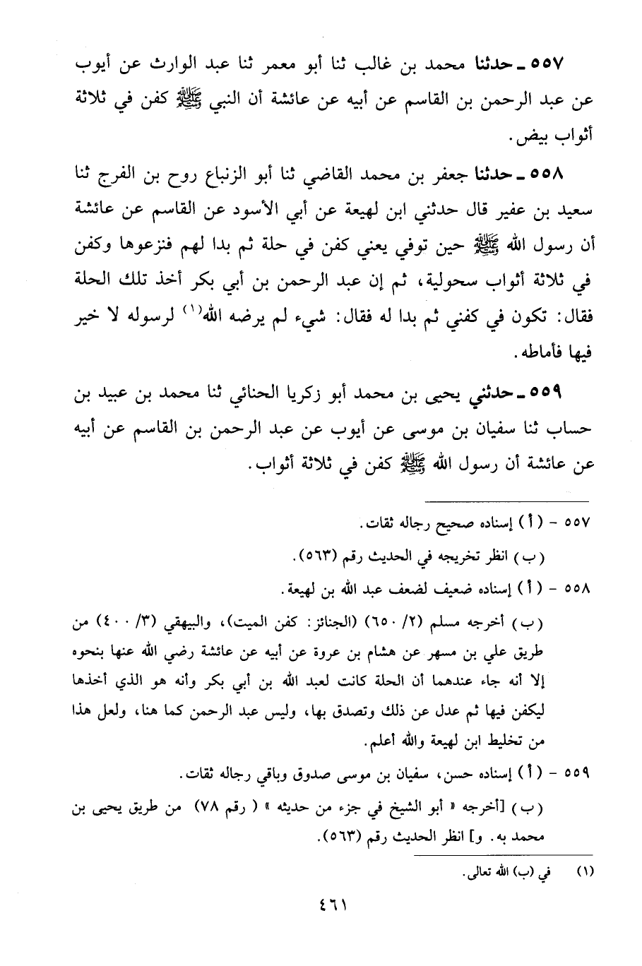 559 - حَدَّثَنِي يَحْيَى بْنُ مُحَمَّدٍ أَبُو زَكَرِيَّا الْحِنَّائِيُّ، ثنا مُحَمَّدُ بْنُ عُبَيْدِ بْنِ حِسَابٍ، ثنا سُفْيَانُ بْنُ مُوسَى، عَنْ أَيُّوبَ، عَنْ عَبْدِ الرَّحْمَنِ بْنِ الْقَاسِمِ، عَنْ أَبِيهِ، عَنْ عَائِشَةَ، أَنَّ رَسُولَ اللَّهِ صَلَّى اللهُ عَلَيْهِ وَسَلَّمَ كُفِّنَ فِي ثَلَاثَةِ أَثْوَابٍ "
