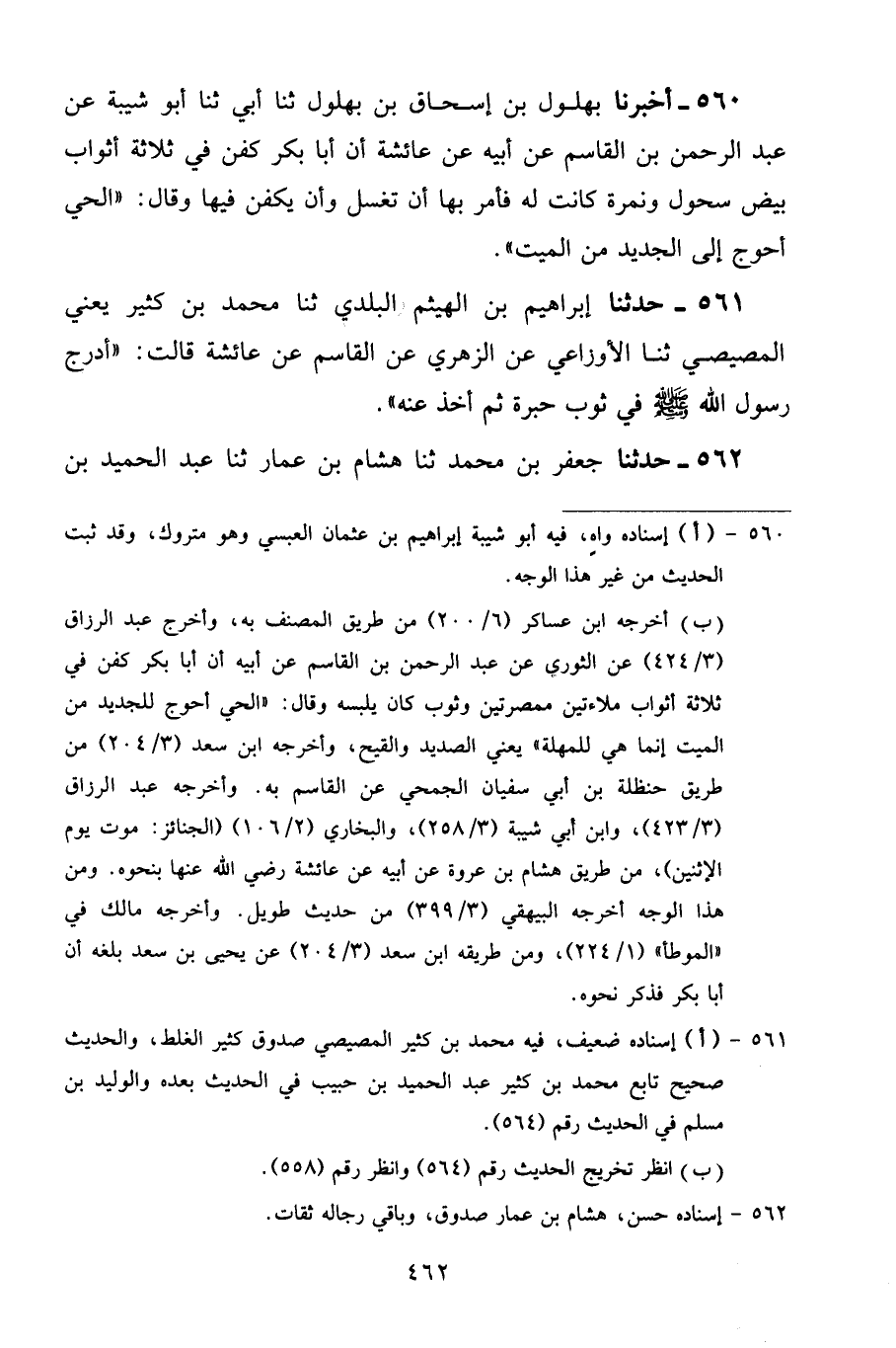 560 - أَخْبَرَنَا بُهْلُولُ بْنُ إِسْحَاقَ بْنِ بُهْلُولٍ، ثنا أَبِي، ثنا أَبُو شَيْبَةَ، عَنْ عَبْدِ الرَّحْمَنِ بْنِ الْقَاسِمِ، عَنْ أَبِيهِ، عَنْ عَائِشَةَ، أَنَّ أَبَا بَكْرٍ، كُفِّنَ فِي ثَلَاثَةِ أَثْوَابٍ بِيضٍ سُحُولٍ وَنَمِرَةٍ كَانَتْ لَهُ فَأَمَرَ بِهَا أَنْ تَغْسَلَ وَأَنْ يُكَفَّنَ فِيهَا، وَقَالَ: «الْحَيُّ أَحْوَجُ إِلَى الْجَدِيدِ مِنَ الْمَيِّتِ»