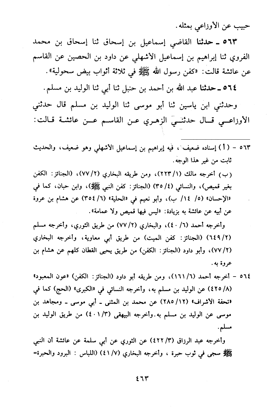 563 - حَدَّثَنَا الْقَاضِي إِسْمَاعِيلُ بْنُ إِسْحَاقَ، ثنا إِسْحَاقُ بْنُ مُحَمَّدٍ الْفَرْوِيُّ، ثنا إِبْرَاهِيمُ بْنُ إِسْمَاعِيلَ الْأَشْهَلِيُّ، عَنْ دَاوُدَ بْنِ الْحُصَيْنِ، عَنِ الْقَاسِمِ، عَنْ عَائِشَةَ، قَالَتْ: «كُفِّنَ رَسُولُ اللَّهِ صَلَّى اللهُ عَلَيْهِ وَسَلَّمَ فِي ثَلَاثَةِ أَثْوَابٍ بِيضٍ سُحُولِيَّةٍ»