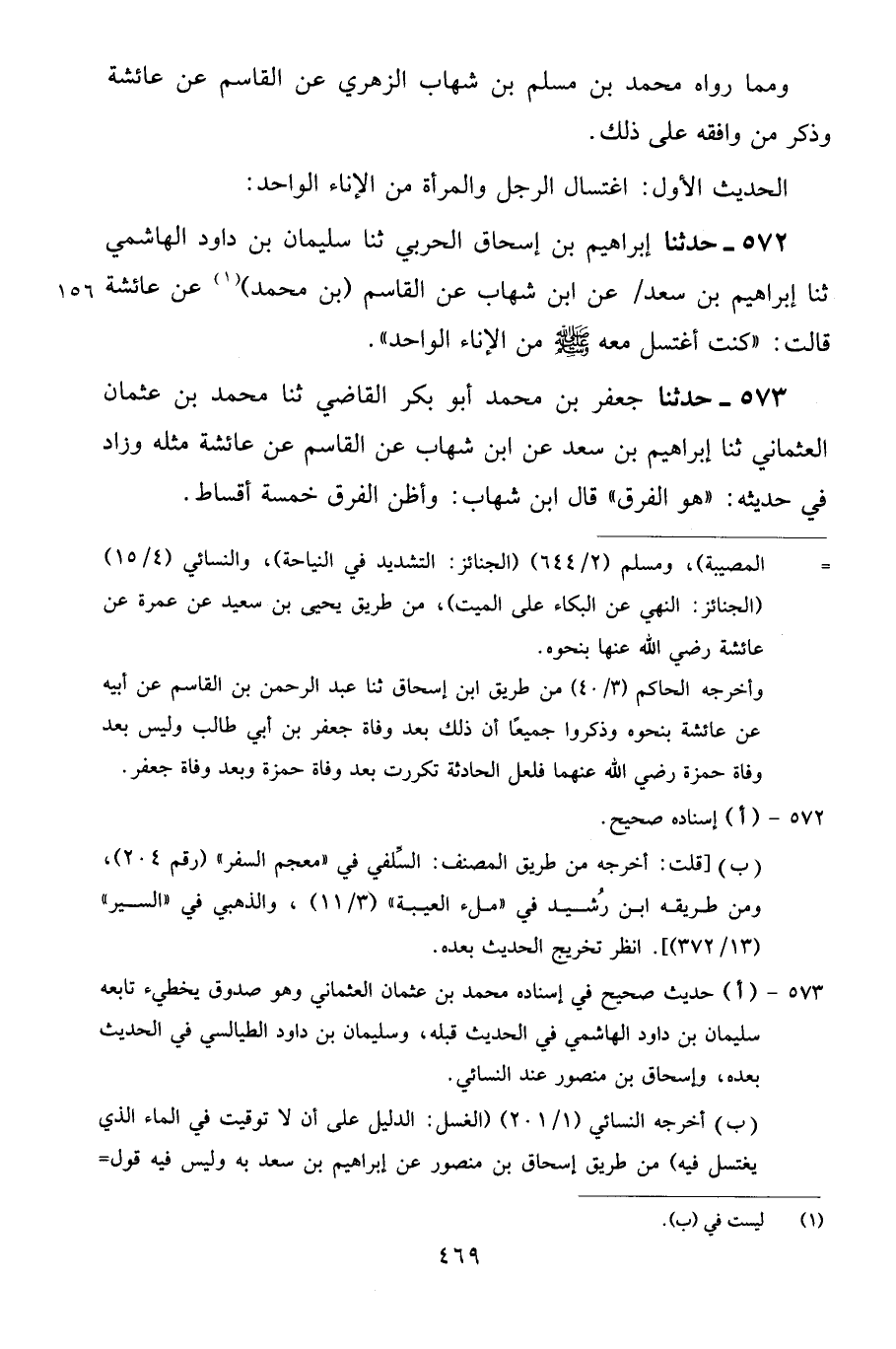 572 - حَدَّثَنَا إِبْرَاهِيمُ بْنُ إِسْحَاقَ الْحَرْبِيُّ، ثنا سُلَيْمَانُ بْنُ دَاوُدَ الْهَاشِمِيُّ، ثنا إِبْرَاهِيمُ بْنُ سَعْدٍ، عَنِ ابْنِ شِهَابٍ، عَنِ الْقَاسِمِ بْنِ مُحَمَّدٍ، عَنْ عَائِشَةَ، قَالَتْ: «كُنْتُ أَغْتَسِلُ مَعَهُ صَلَّى اللهُ عَلَيْهِ وَسَلَّمَ مِنَ الْإِنَاءِ الْوَاحِدِ»