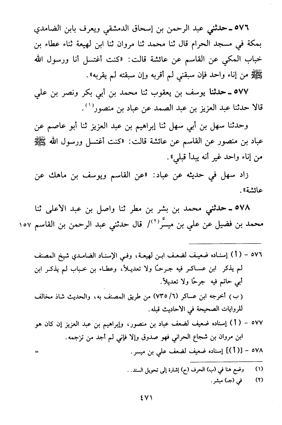 578 - حَدَّثَنِي مُحَمَّدُ بْنُ بِشْرِ بْنِ مَطَرٍ، ثنا وَاصِلُ بْنُ عَبْدِ الْأَعْلَى، ثنا مُحَمَّدُ بْنُ فُضَيْلٍ، عَنْ عَلِيِّ بْنِ مُيَسِّرٍ قَالَ: حَدَّثَنِي عَبْدُ الرَّحْمَنِ بْنُ الْقَاسِمِ -[472]-، عَنْ أَبِيهِ، عَنْ عَائِشَةَ قَالَتْ: «كُنْتُ أَغْتَسِلُ أَنَا وَرَسُولُ اللَّهِ صَلَّى اللهُ عَلَيْهِ وَسَلَّمَ مِنَ الْإِنَاءِ الْوَاحِدِ لَيْسَ بِالْكَثِيرِ الْمَاءِ»