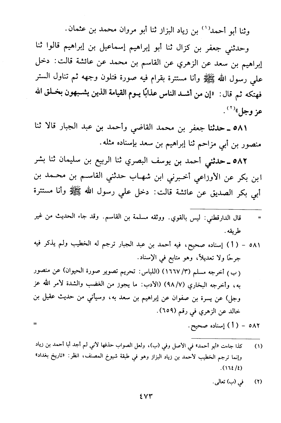 582 - حَدَّثَنِي أَحْمَدُ بْنُ يُوسُفَ الْبَصْرِيُّ، ثنا الرَّبِيعُ بْنُ سُلَيْمَانَ، ثنا بِشْرُ بْنُ بَكْرٍ، عَنِ الْأَوْزَاعِيِّ، أَخْبَرَنِي ابْنُ شِهَابٍ، حَدَّثَنِي الْقَاسِمُ بْنُ مُحَمَّدِ بْنِ أَبِي بَكْرٍ الصِّدِّيقِ، عَنْ عَائِشَةَ قَالَتْ دَخَلَ عَلِيَّ رَسُولُ اللَّهِ صَلَّى اللهُ عَلَيْهِ وَسَلَّمَ، وَأَنَا مُسْتَتِرَةٌ -[474]- بِقِرَامٍ فِيهِ صُورَةٌ فَهَتَّكَهُ وَقَالَ: «إِنَّ أَشَدَّ النَّاسِ عَذَابًا يَوْمَ الْقِيَامَةِ الَّذِينَ يُشَبِّهُونَ بِخُلُقِ اللَّهِ عَزَّ وَجَلَّ»