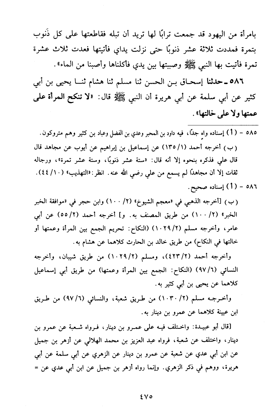 586 - حَدَّثَنَا إِسْحَاقُ بْنُ الْحَسَنِ، ثنا مُسْلِمٌ، ثنا هِشَامٌ، ثنا يَحْيَى بْنُ أَبِي كَثِيرٍ، عَنْ أَبِي سَلَمَةَ، عَنْ أَبِي هُرَيْرَةَ، أَنَّ النَّبِيَّ صَلَّى اللهُ عَلَيْهِ وَسَلَّمَ قَالَ: «لَا تُنْكَحُ الْمَرْأَةُ عَلَى عَمَّتِهَا وَلَا عَلَى خَالَتِهَا»