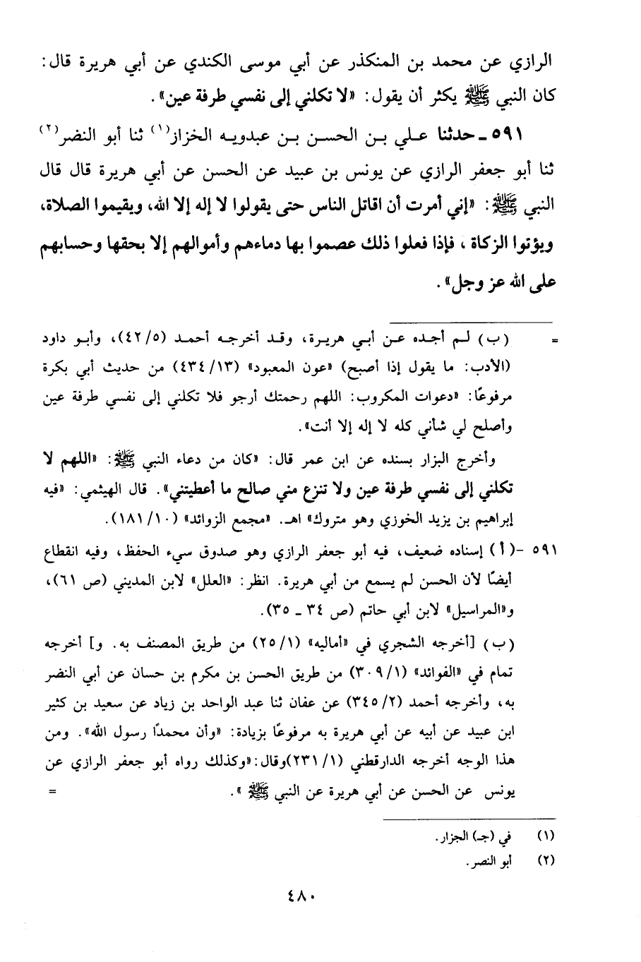 591 - حَدَّثَنَا عَلِيُّ بْنُ الْحَسَنِ بْنِ عَبْدُوَيْهِ الْخَزَّازُ، ثنا أَبُو النَّضْرِ، ثنا أَبُو جَعْفَرٍ الرَّازِيُّ، عَنْ يُونُسَ بْنِ عُبَيْدٍ، عَنِ الْحَسَنِ، عَنْ أَبِي هُرَيْرَةَ قَالَ قَالَ: النَّبِيُّ صَلَّى اللهُ عَلَيْهِ وَسَلَّمَ: «إِنِّي أُمِرْتُ أَنْ أُقَاتِلَ النَّاسَ حَتَّى يَقُولُوا لَا إِلَهَ إِلَّا اللَّهُ، وَيُقِيمُوا الصَّلَاةَ، وَيُؤْتُوا الزَّكَاةَ، فَإِذَا فَعَلُوا ذَلِكَ عَصَمُوا بِهَا دِمَاءَهُمْ، وَأَمْوَالَهُمْ إِلَّا بِحَقِّهَا وَحِسَابُهُمْ عَلَى اللَّهِ عَزَّ وَجَلَّ»
