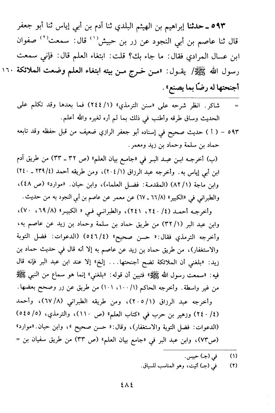 593 - حَدَّثَنَا إِبْرَاهِيمُ بْنُ الْهَيْثَمِ الْبَلَدِيُّ، ثنا آدَمُ بْنُ أَبِي إِيَاسٍ، ثنا أَبُو جَعْفَرٍ قَالَ: ثنا عَاصِمُ بْنُ أَبَى النَّجُودِ، عَنْ زِرِّ بْنِ حُبَيْشٍ قَالَ: سَمِعْتُ صَفْوَانَ بْنَ عَسَّالٍ الْمُرَادِيَّ، فَقَالَ: مَا جَاءَ بِكَ؟ قُلْتُ: ابْتِغَاءُ الْعِلْمِ، قَالَ: فَإِنِّي سَمِعْتُ رَسُولَ اللَّهِ صَلَّى اللهُ عَلَيْهِ وَسَلَّمَ يَقُولُ: «مَنْ خَرَجَ مِنْ بَيْتِهِ ابْتِغَاءَ الْعِلْمِ وَضَعَتِ الْمَلَائِكَةُ أَجْنِحَتَهَا لَهُ رِضًا بِمَا يَصْنَعُ»