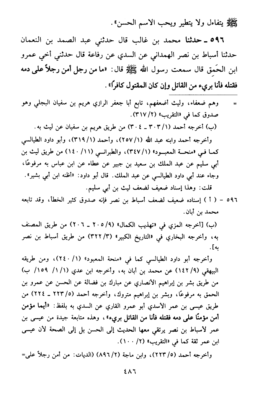 596 - حَدَّثَنَا مُحَمَّدُ بْنُ غَالِبٍ قَالَ: حَدَّثَنِي عَبْدُ الصَّمَدِ بْنُ النُّعْمَانِ، حَدَّثَنَا أَسْبَاطُ بْنُ نَصْرٍ الْهَمْدَانِيُّ، عَنِ السُّدِّيِّ، عَنْ رِفَاعَةَ قَالَ: حَدَّثَنِي أَخِي عَمْرُو بْنُ الْحَمِقِ، قَالَ سَمِعْتُ رَسُولَ اللَّهِ صَلَّى اللهُ عَلَيْهِ وَسَلَّمَ قَالَ: «مَا مِنْ رَجُلٍ أَمَّنَ رَجُلًا عَلَى دَمِهِ فَقَتَلَهُ فَأَنَا بَرِيءٌ مِنَ الْقَاتِلِ وَإِنْ كَانَ الْمَقْتُولُ كَافِرًا»