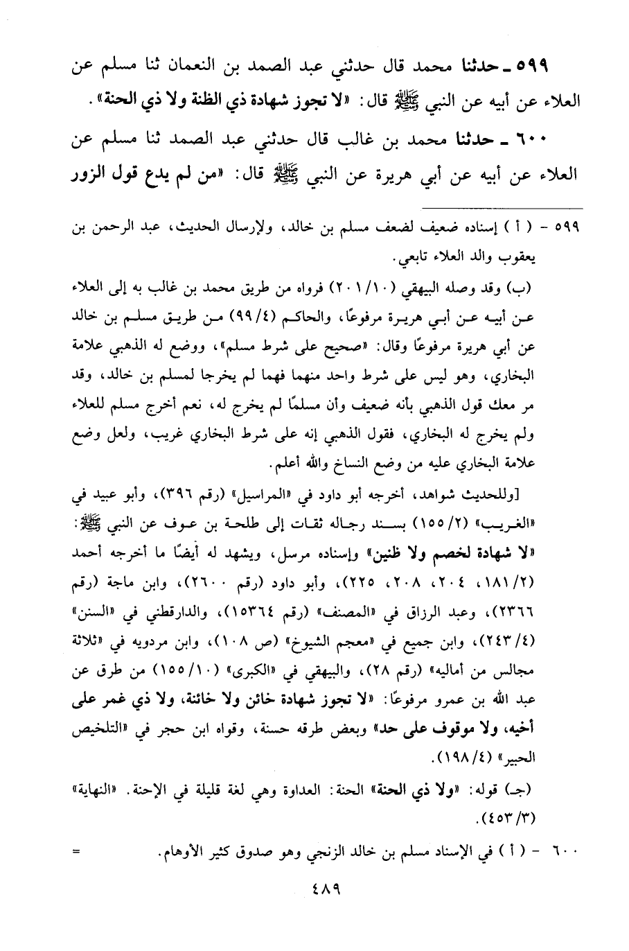 599 - حَدَّثَنَا مُحَمَّدٌ قَالَ: حَدَّثَنِي عَبْدُ الصَّمَدِ بْنُ النُّعْمَانِ، ثنا مُسْلِمٌ، عَنِ الْعَلَاءِ، عَنْ أَبِيهِ، عَنِ النَّبِيِّ صَلَّى اللهُ عَلَيْهِ وَسَلَّمَ قَالَ: «لَا تَجُوزُ شَهَادَةُ ذِي الظِّنَّةِ وَلَا ذِي الْحِنَةِ»
