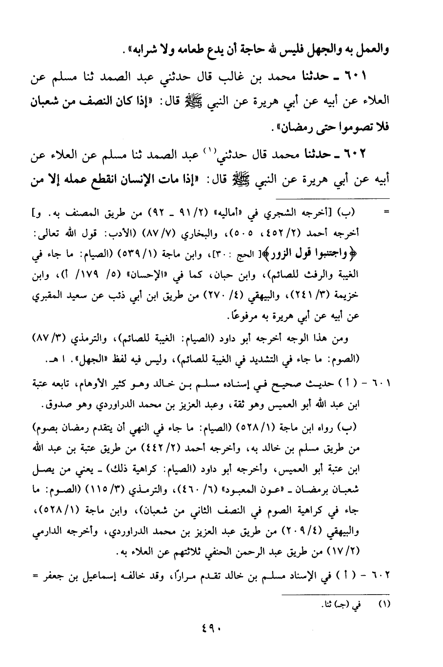 601 - حَدَّثَنَا مُحَمَّدُ بْنُ غَالِبٍ قَالَ: حَدَّثَنِي عَبْدُ الصَّمَدِ، ثنا مُسْلِمٌ، عَنِ الْعَلَاءِ، عَنْ أَبِيهِ، عَنْ أَبِي هُرَيْرَةَ، عَنِ النَّبِيِّ صَلَّى اللهُ عَلَيْهِ وَسَلَّمَ قَالَ: «إِذَا كَانَ النِّصْفُ مِنْ شَعْبَانَ فَلَا تَصُومُوا حَتَّى رَمَضَانَ»