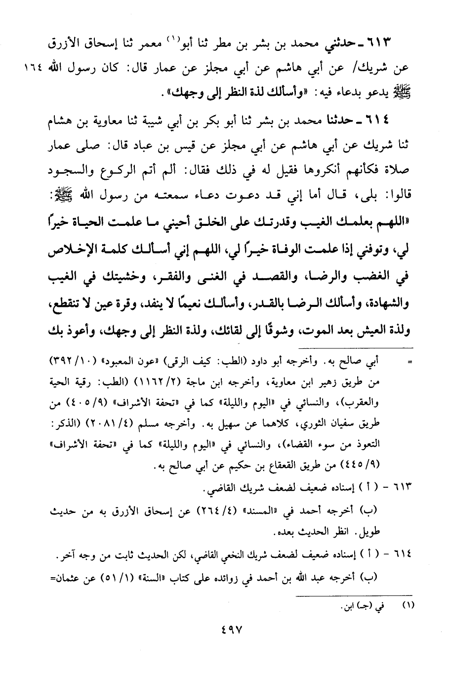 613 - حَدَّثَنِي مُحَمَّدُ بْنُ بِشْرِ بْنِ مَطَرٍ، ثنا أَبُو مَعْمَرٍ، ثنا إِسْحَاقُ الْأَزْرَقُ، عَنْ شَرِيكٍ، عَنْ أَبِي هَاشِمٍ، عَنْ أَبِي مِجْلَزٍ، عَنْ عَمَّارٍ قَالَ: كَانَ رَسُولُ اللَّهِ صَلَّى اللهُ عَلَيْهِ وَسَلَّمَ يَدْعُو بِدُعَاءٍ فِيهِ: «وَأَسْأَلُكَ لَذَّةَ النَّظَرِ إِلَى وَجْهِكَ»