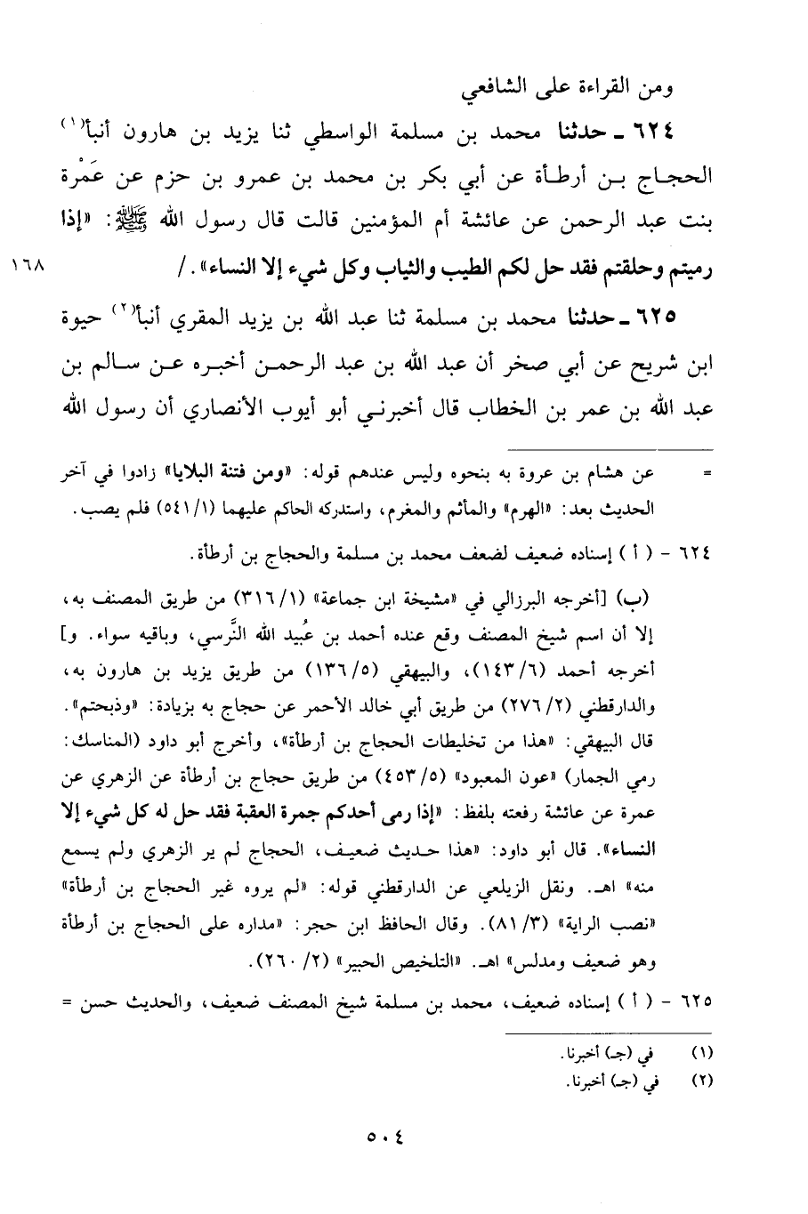 624 - حَدَّثَنَا مُحَمَّدُ بْنُ مَسْلَمَةَ الْوَاسِطِيُّ، ثنا يَزِيدُ بْنُ هَارُونَ، أَنْبَأَ الْحَجَّاجُ بْنُ أَرْطَأَةَ، عَنْ أَبِي بَكْرِ بْنِ مُحَمَّدِ بْنِ عَمْرِو بْنِ حَزْمٍ، عَنْ عَمْرَةَ بِنْتِ عَبْدِ الرَّحْمَنِ، عَنْ عَائِشَةَ أُمِّ الْمُؤْمِنِينَ، قَالَتْ: قَالَ رَسُولُ اللَّهِ صَلَّى اللهُ عَلَيْهِ وَسَلَّمَ: «إِذَا رَمَيْتُمْ وَحَلَقْتُمْ فَقَدْ حَلَّ لَكُمُ الطِّيبُ وَالثِّيَابُ وَكُلُّ شَيْءٍ إِلَّا النِّسَاءَ»