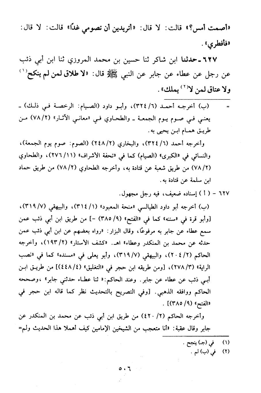 627 - حَدَّثَنَا ابْنُ شَاكِرٍ، ثنا حُسَيْنُ بْنُ مُحَمَّدٍ الْمَرْوَزِيُّ، ثنا ابْنُ أَبِي ذِئْبٍ، عَنْ رَجُلٍ، عَنْ عَطَاءٍ، عَنْ جَابِرٍ، عَنِ النَّبِيِّ صَلَّى اللهُ عَلَيْهِ وَسَلَّمَ قَالَ: «لَا طَلَاقَ لِمَنْ لَمْ يَنْكِحْ وَلَا عَتَاقَ لِمَنْ لَا يَمْلِكُ»