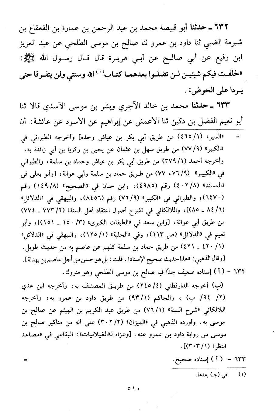 632 - حَدَّثَنَا أَبُو قَبِيصَةَ مُحَمَّدُ بْنُ عَبْدِ الرَّحْمَنِ بْنِ عُمَارَةَ بْنِ الْقَعْقَاعِ بْنِ شُبْرُمَةَ الضَّبِّيُّ، ثنا دَاوُدُ بْنُ عَمْرٍو، ثنا صَالِحُ بْنُ مُوسَى الطَّلْحِيُّ، عَنْ عَبْدِ الْعَزِيزِ بْنِ رُفَيْعٍ، عَنْ أَبِي صَالِحٍ، عَنْ أَبِي هُرَيْرَةَ قَالَ: قَالَ رَسُولُ اللَّهِ صَلَّى اللهُ عَلَيْهِ وَسَلَّمَ: «خَلَّفْتُ فِيكُمْ شَيْئَيْنِ لَنْ تَضِلُّوا بَعْدَهُمَا كِتَابَ اللَّهِ وَسُنَّتِي وَلَنْ يَتَفَرَّقَا حَتَّى يَرِدَا عَلَيَّ الْحَوْضَ»