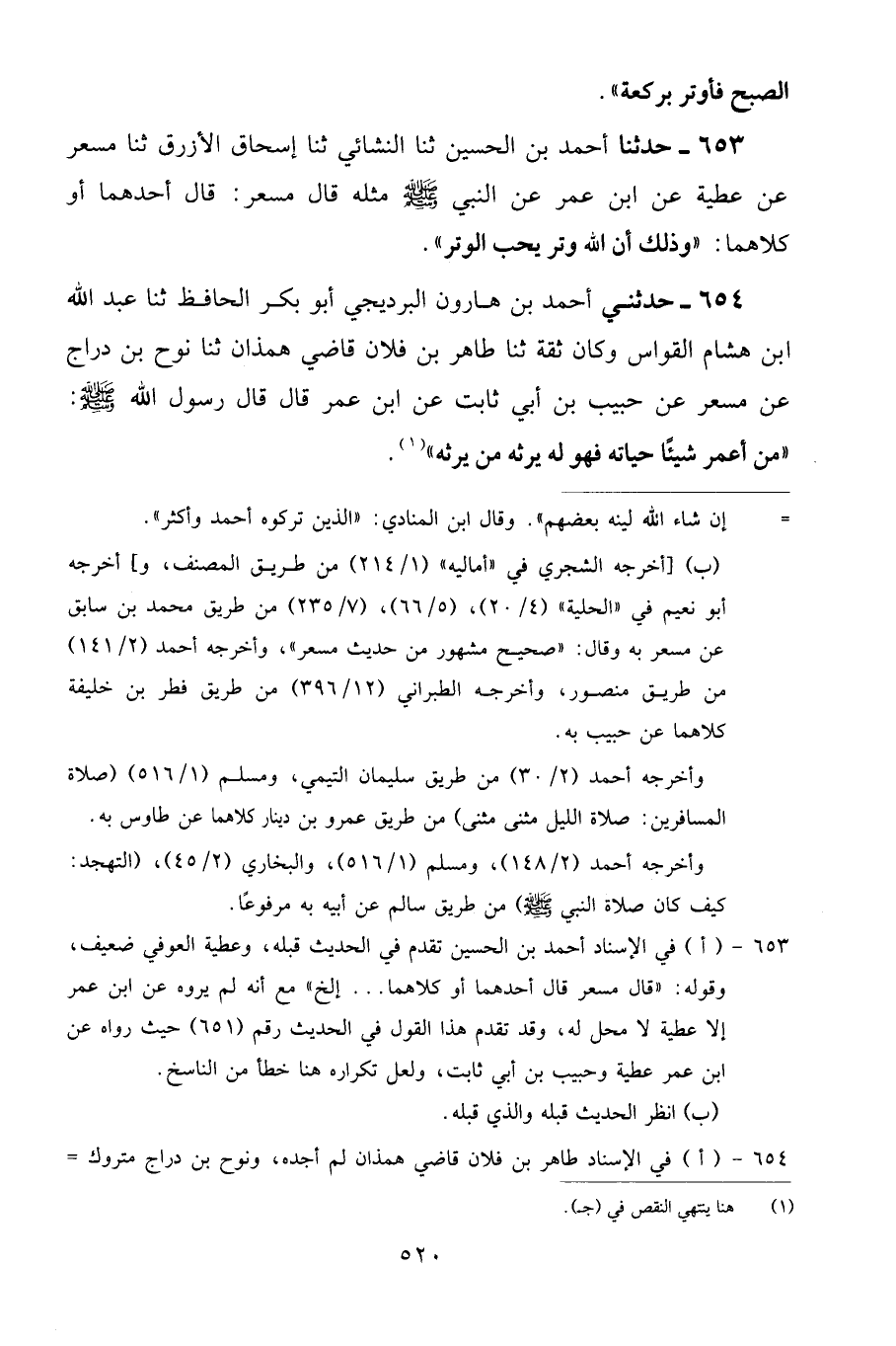 654 - حَدَّثَنِي أَحْمَدُ بْنُ هَارُونَ الْبَرْدِيجِيُّ أَبُو بَكْرٍ الْحَافِظُ، ثنا عَبْدُ اللَّهِ بْنُ هِشَامٍ الْقَوَّاسُ وَكَانَ ثِقَةً ثنا طَاهِرُ بْنُ فُلَانٍ قَاضِي هَمْذَانَ، ثنا نُوحُ بْنُ دَرَّاجٍ، عَنْ مِسْعَرٍ، عَنْ حَبِيبِ بْنِ أَبِي ثَابِتٍ، عَنِ ابْنِ عُمَرَ قَالَ: قَالَ رَسُولُ اللَّهِ صَلَّى اللهُ عَلَيْهِ وَسَلَّمَ: «مَنْ أَعْمَرَ شَيْئًا حَيَاتَهُ فَهُوَ لَهُ يَرِثُهُ مَنْ يَرِثُهُ»