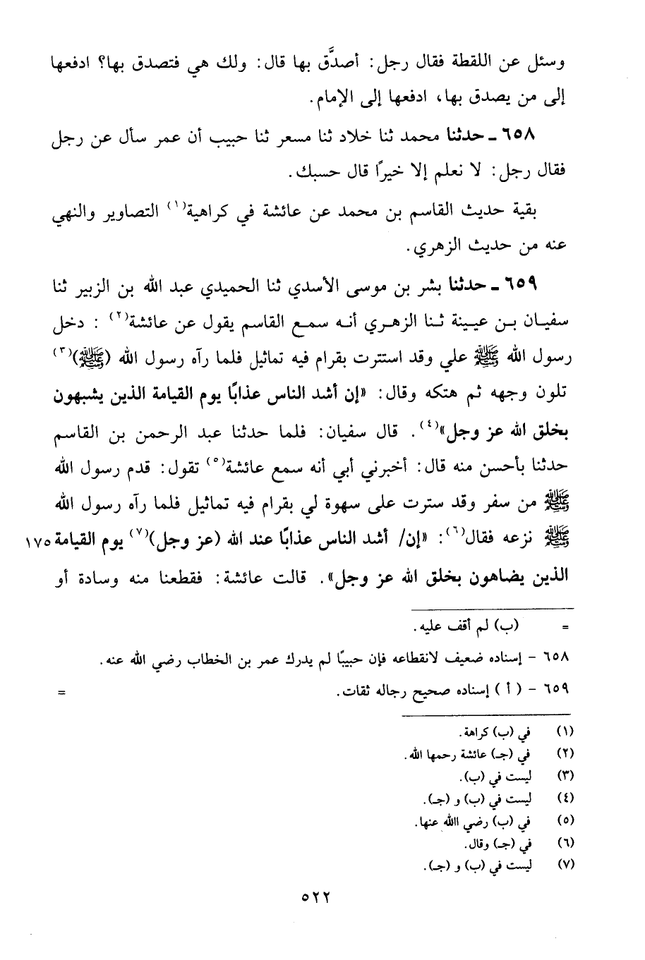 659 - حَدَّثَنَا بِشْرُ بْنُ مُوسَى الْأَسَدِيُّ، ثنا الْحُمَيْدِيُّ عَبْدُ اللَّهِ بْنُ الزُّبَيْرِ، ثنا سُفْيَانُ بْنُ عُيَيْنَةَ، ثنا الزُّهْرِيُّ، أَنَّهُ سَمِعَ الْقَاسِمَ يَقُولُ، عَنْ عَائِشَةَ،: دَخَلَ رَسُولُ اللَّهِ صَلَّى اللهُ عَلَيْهِ وَسَلَّمَ عَلَيَّ وَقَدِ اسْتَتَرْتُ بِقِرَامٍ فِيهِ تَمَاثِيلُ فَلَمَّا رَآهُ رَسُولُ اللَّهِ صَلَّى اللهُ عَلَيْهِ وَسَلَّمَ تَلَوَّنَ وَجْهُهُ، ثُمَّ هَتَّكَهُ، وَقَالَ: «إِنَّ أَشَدَّ النَّاسِ عَذَابًا يَوْمَ الْقِيَامَةِ الَّذِينَ يُشَبِّهُونَ بِخَلْقِ اللَّهِ عَزَّ وَجَلَّ» قَالَ سُفْيَانُ: فَلَمَّا حَدَّثَنَا عَبْدُ الرَّحْمَنِ بْنُ الْقَاسِمِ، حَدَّثَنَا بِأَحْسَنَ مِنْهُ، قَالَ: أَخْبَرَنِي أَبِي أَنَّهُ سَمِعَ عَائِشَةَ تَقُولُ: قَدِمَ رَسُولُ اللَّهِ صَلَّى اللهُ عَلَيْهِ وَسَلَّمَ منْ سَفَرٍ، وَقَدْ سُتِرْتُ عَلَى سَهْوَةٍ لِي بِقِرَامٍ فِيهِ تَمَاثِيلُ، فَلَمَّا رَآهُ رَسُولُ اللَّهِ صَلَّى اللهُ عَلَيْهِ وَسَلَّمَ نَزَعَهُ، فَقَالَ: «إِنَّ أَشَدَّ النَّاسِ عَذَابًا عِنْدَ اللَّهِ عَزَّ وَجَلَّ يَوْمَ الْقِيَامَةِ الَّذِينَ يُضَاهُونَ بِخَلْقِ اللَّهِ عَزَّ وَجَلَّ» قَالَتْ عَائِشَةُ: فَقَطَعْنَا مِنْهُ وِسَادَةً أَوْ -[523]- وِسَادَتَيْنِ