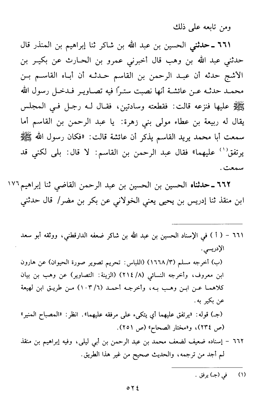 661 - حَدَّثَنِي الْحُسَيْنُ بْنُ عَبْدِ اللَّهِ بْنِ شَاكِرٍ، ثنا إِبْرَاهِيمُ بْنُ الْمُنْذِرِ قَالَ: حَدَّثَنِي عَبْدُ اللَّهِ بْنُ وَهْبٍ قَالَ: أَخْبَرَنِي عَمْرُو بْنُ الْحَارِثِ، عَنْ بُكَيْرِ بْنِ الْأَشَجِّ، حَدَّثَهُ أَنَّ عَبْدَ الرَّحْمَنِ بْنَ الْقَاسِمِ حَدَّثَهُ أَنَّ أَبَاهُ الْقَاسِمَ بْنَ مُحَمَّدٍ حَدَّثَهُ عَنْ عَائِشَةَ، أَنَّهَا نَصَبَتْ سِتْرًا فِيهِ تَصَاوِيرُ، فَدَخَلَ رَسُولُ اللَّهِ صَلَّى اللهُ عَلَيْهِ وَسَلَّمَ عَلَيْهَا فَنَزَعَهُ، قَالَتْ: فَقَطَعْتُهُ وِسَادَتَيْنِ " فَقَالَ لَهُ رَجُلٌ فِي الْمَجْلِسِ يُقَالُ لَهُ رَبِيعَةُ بْنُ عَطَاءٍ مَوْلَى بَنِي زُهْرَةَ: يَا عَبْدَ الرَّحْمَنِ بْنَ الْقَاسِمِ أَمَا سَمِعْتَ أَبَا مُحَمَّدٍ يُرِيدُ الْقَاسِمَ يَذْكُرُ أَنَّ عَائِشَةَ قَالَتْ: فَكَانَ رَسُولُ اللَّهِ صَلَّى اللهُ عَلَيْهِ وَسَلَّمَ يَرْتَفِقُ عَلَيْهِمَا "، فَقَالَ عَبْدُ الرَّحْمَنِ بْنُ الْقَاسِمِ: لَا، قَالَ: بَلَى لَكِنِّي قَدْ سَمِعْتُ