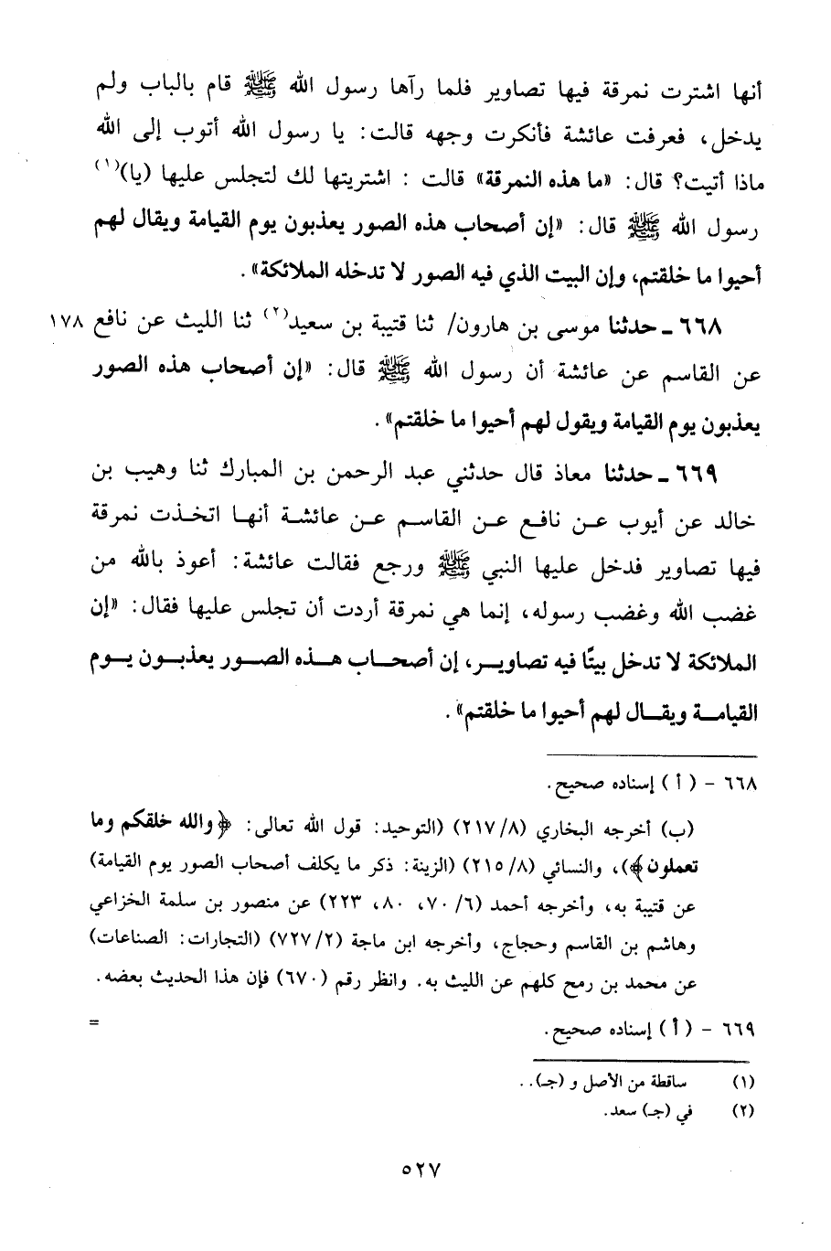 669 - حَدَّثَنَا مُعَاذٌ قَالَ: حَدَّثَنِي عَبْدُ الرَّحْمَنِ بْنُ الْمُبَارَكِ، ثنا وُهَيْبُ بْنُ خَالِدٍ، عَنْ أَيُّوبَ، عَنْ نَافِعٍ، عَنِ الْقَاسِمِ، عَنْ عَائِشَةَ، أَنَّهَا اتَّخَذَتْ نُمْرُقَةً فِيهَا تَصَاوِيرُ، فَدَخَلَ عَلَيْهَا النَّبِيُّ صَلَّى اللهُ عَلَيْهِ وَسَلَّمَ وَرَجَعَ، فَقَالَتْ عَائِشَةُ: أَعُوذُ بِاللَّهِ مِنْ غَضَبِ اللَّهِ وَغَضَبِ رَسُولِهِ، إِنَّمَا هِيَ نُمْرُقَةٌ أَرَدْتُ أَنْ تَجْلِسَ عَلَيْهَا، فَقَالَ: " إِنَّ الْمَلَائِكَةَ لَا تَدْخُلُ بَيْتًا فِيهِ تَصَاوِيرُ، إِنَّ أَصْحَابَ هَذِهِ الصُّوَرِ يُعَذَّبُونَ يَوْمَ الْقِيَامَةِ، وَيُقَالُ لَهُمْ: أَحْيُوا مَا خَلَقْتُمْ "
