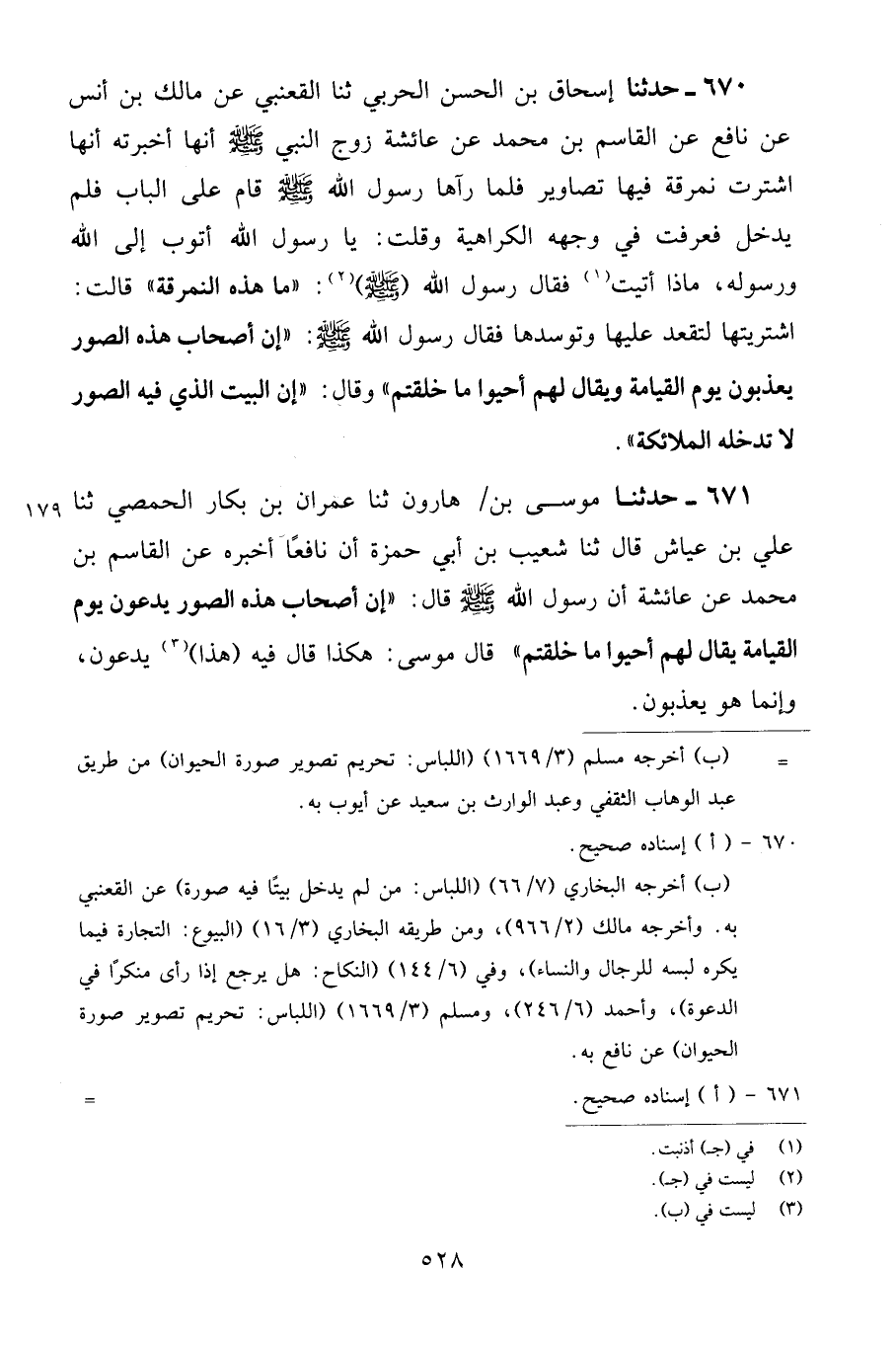 670 - حَدَّثَنَا إِسْحَاقُ بْنُ الْحَسَنِ الْحَرْبِيُّ، ثنا الْقَعْنَبِيُّ، عَنْ مَالِكِ بْنِ أَنَسٍ، عَنْ نَافِعٍ، عَنِ الْقَاسِمِ بْنِ مُحَمَّدٍ، عَنْ عَائِشَةَ، زَوْجِ النَّبِيِّ صَلَّى اللهُ عَلَيْهِ وَسَلَّمَ أَنَّهَا أَخْبَرَتْهُ أَنَّهَا اشْتَرَتْ نُمْرُقَةً فِيهَا تَصَاوِيرُ فَلَمَّا رَآهَا رَسُولُ اللَّهِ صَلَّى اللهُ عَلَيْهِ وَسَلَّمَ، قَامَ عَلَى الْبَابِ فَلَمْ يَدْخُلْ فَعَرَفْتُ فِي وَجْهِهِ الْكَرَاهِيَةَ، وَقُلْتُ: يَا رَسُولَ اللَّهِ أَتُوبُ إِلَى اللَّهِ وَرَسُولِهِ، مَاذَا أَتَيْتُ؟ فَقَالَ رَسُولُ اللَّهِ صَلَّى اللهُ عَلَيْهِ وَسَلَّمَ: «مَا هَذِهِ النُّمْرُقَةُ»، قَالَتِ: اشْتَرَيْتُهَا لِتَقْعُدَ عَلَيْهَا، وَتَوَسَّدَهَا، فَقَالَ: رَسُولُ اللَّهِ صَلَّى اللهُ عَلَيْهِ وَسَلَّمَ: " إِنَّ أَصْحَابَ هَذِهِ الصُّوَرِ يُعَذَّبُونَ يَوْمَ الْقِيَامَةِ، وَيُقَالُ لَهُمْ: أَحْيُوا مَا خَلَقْتُمْ " وَقَالَ: «إِنَّ الْبَيْتَ الَّذِي فِيهِ الصُّوَرُ لَا تَدْخُلُهُ الْمَلَائِكَةُ»