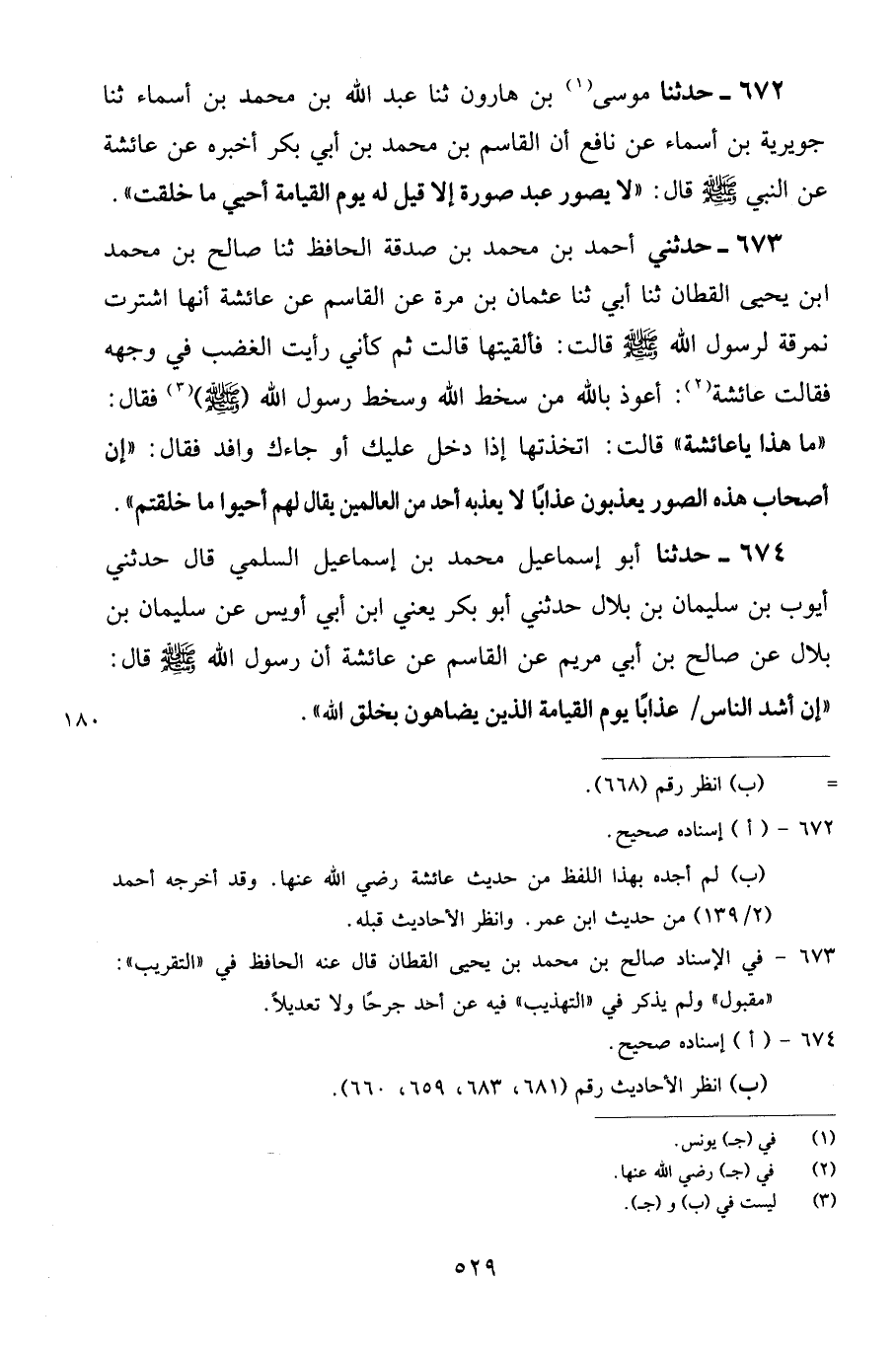 672 - حَدَّثَنَا مُوسَى بْنُ هَارُونَ، ثنا عَبْدُ اللَّهِ بْنُ مُحَمَّدِ بْنِ أَسْمَاءَ، ثنا جُوَيْرِيَةُ بْنُ أَسْمَاءَ، عَنْ نَافِعٍ، أَنَّ الْقَاسِمَ بْنَ مُحَمَّدِ بْنِ أَبِي بَكْرٍ، أَخْبَرَهُ، عَنْ عَائِشَةَ، عَنِ النَّبِيِّ صَلَّى اللهُ عَلَيْهِ وَسَلَّمَ قَالَ: " لَا يُصَوِّرُ عَبْدٌ صُورَةً إِلَّا قِيلَ لَهُ يَوْمَ الْقِيَامَةِ: أَحْيِ مَا خَلَقْتَ "