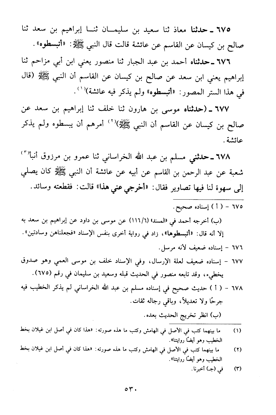 676 - حَدَّثَنَاهُ أَحْمَدُ بْنُ عَبْدِ الْجَبَّارِ، ثنا مَنْصُورٌ يَعْنِي ابْنَ أَبِي مُزَاحِمٍ، ثنا إِبْرَاهِيمُ يَعْنِي ابْنَ سَعْدٍ، عَنْ صَالِحِ بْنِ كَيْسَانَ، عَنِ الْقَاسِمِ، أَنَّ النَّبِيَّ صَلَّى اللهُ عَلَيْهِ وَسَلَّمَ قَالَ فِي هَذَا السِّتْرِ الْمُصَوَّرِ: «أَتَبْسِطُوهُ» وَلَمْ يَذْكُرْ فِيهِ عَائِشَةَ
