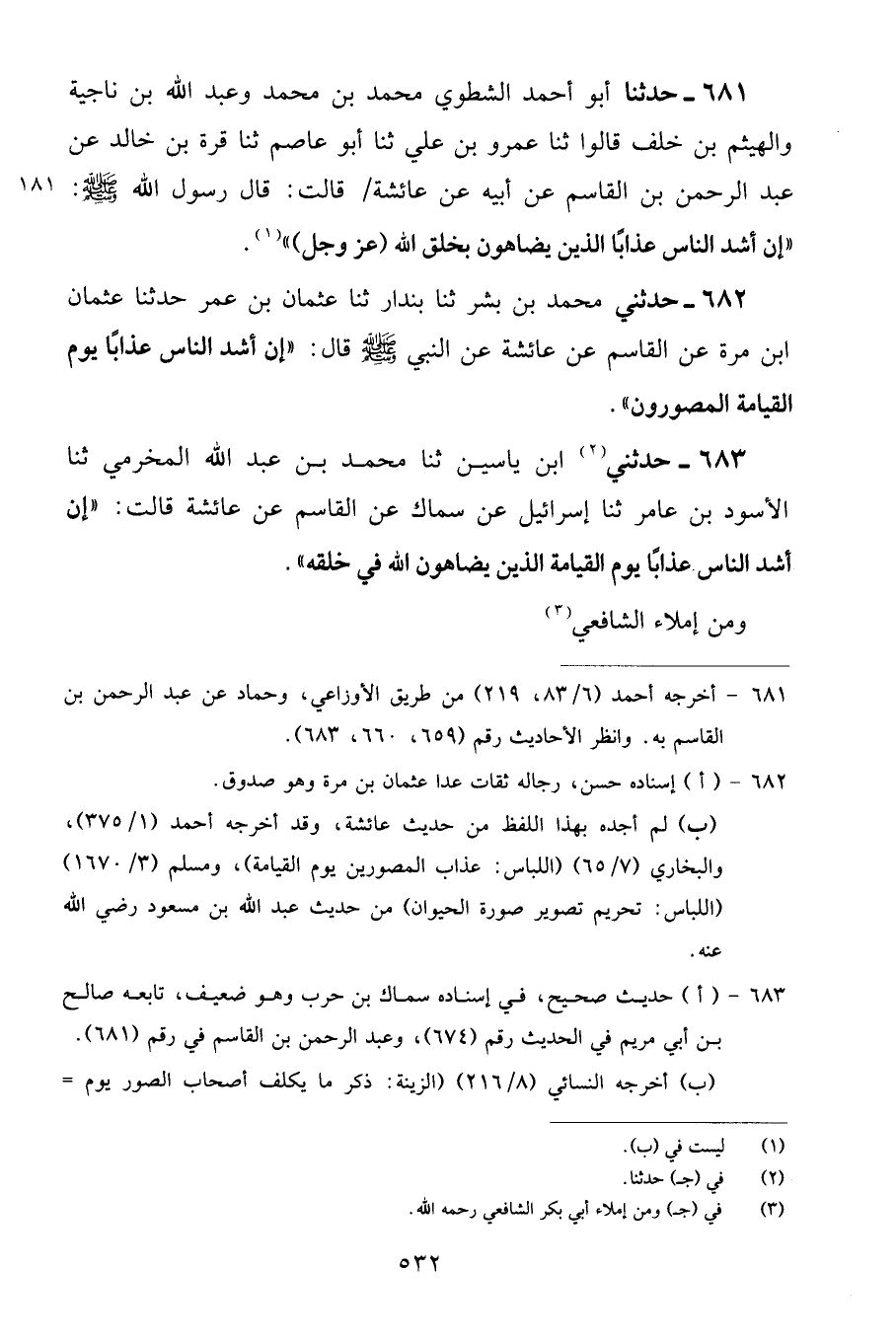 681 - حَدَّثَنَا أَبُو أَحْمَدَ الشَّطَوِيُّ مُحَمَّدُ بْنُ مُحَمَّدٍ، وَعَبْدُ اللَّهِ بْنُ نَاجِيَةَ، وَالْهَيْثَمُ بْنُ خَلَفٍ، قَالُوا: ثنا عَمْرُو بْنُ عَلِيٍّ، ثنا أَبُو عَاصِمٍ، ثنا قُرَّةُ بْنُ خَالِدٍ، عَنْ عَبْدِ الرَّحْمَنِ بْنِ الْقَاسِمِ، عَنْ أَبِيهِ، عَنْ عَائِشَةَ، قَالَتْ: قَالَ رَسُولُ اللَّهِ صَلَّى اللهُ عَلَيْهِ وَسَلَّمَ: «إِنَّ أَشَدَّ النَّاسِ عَذَابًا الَّذِينَ يُضَاهُونَ بِخَلْقِ اللَّهِ عَزَّ وَجَلَّ»