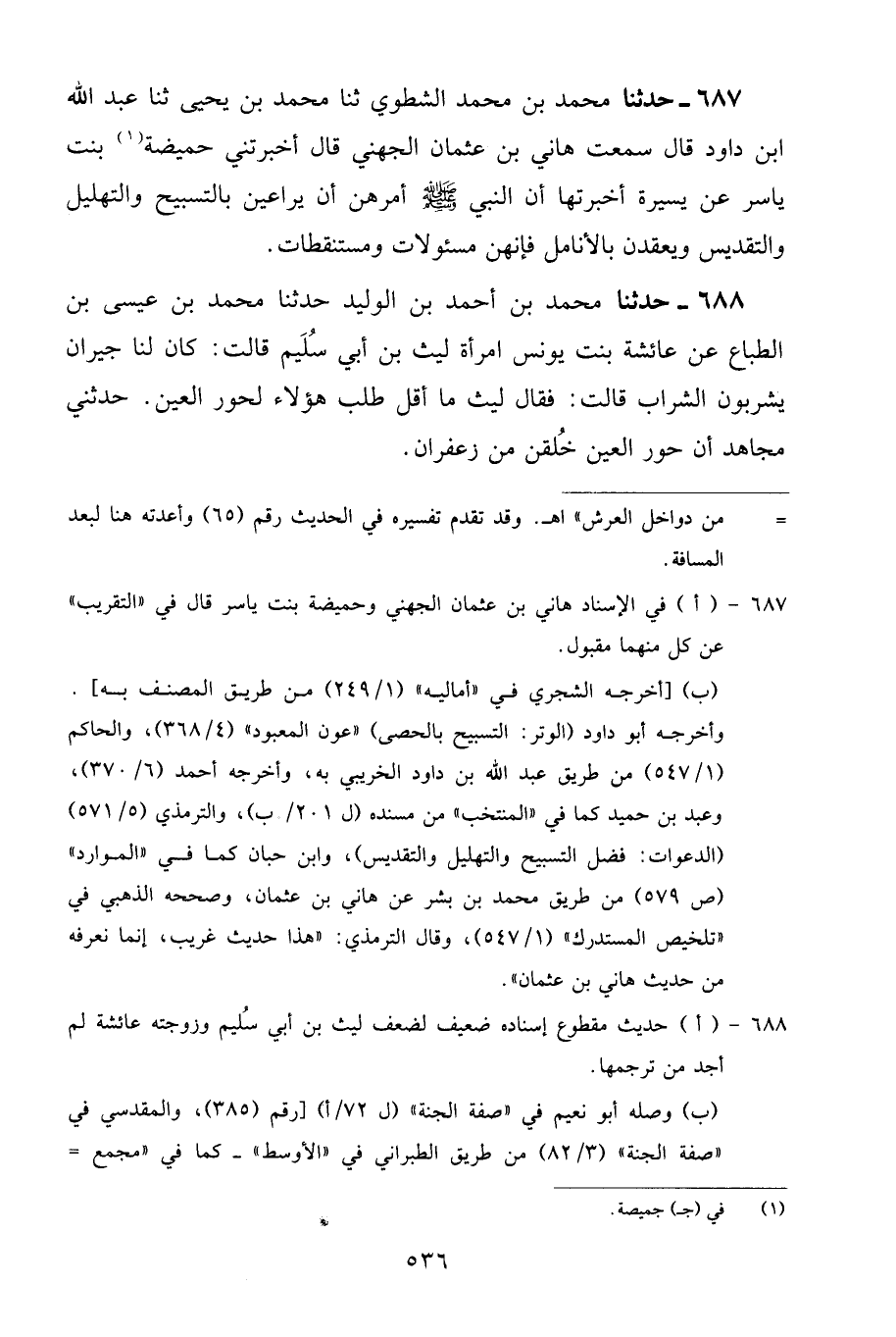 687 - حَدَّثَنَا مُحَمَّدُ بْنُ مُحَمَّدٍ الْشَّطَوِيُّ، ثنا مُحَمَّدُ بْنُ يَحْيَى، ثنا عَبْدُ اللَّهِ بْنُ دَاوُدَ قَالَ: سَمِعْتُ هَانِئَ بْنَ عُثْمَانَ الْجُهَنِيَّ قَالَ: أَخْبَرَتْنِي حُمَيْضَةُ بِنْتُ يَاسِرٍ، عَنْ يُسَيْرَةَ أَخْبَرَتْهَا أَنَّ النَّبِيَّ صَلَّى اللهُ عَلَيْهِ وَسَلَّمَ أَمَرَهُنَّ أَنْ يُرَاعِينَ بِالتَّسْبِيحِ وَالتَّهْلِيلِ وَالتَّقْدِيسِ وَيَعْقِدْنَ بِالْأَنَامِلِ، فَإِنَّهُنَّ مَسْئُولَاتٌ وَمُسْتَنْطَقَاتٌ "
