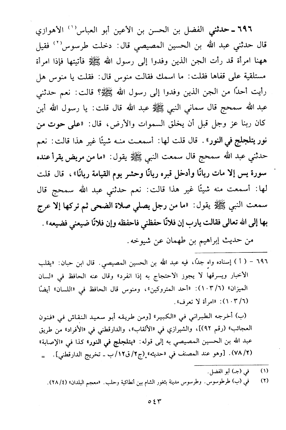 696 - حَدَّثَنِي الْفَضْلُ بْنُ الْحَسَنِ بْنِ الْأَعْيُنِ أَبُو الْعَبَّاسِ الْأَهْوَازِيُّ قَالَ: حَدَّثَنِي عَبْدُ اللَّهِ بْنُ الْحُسَيْنِ الْمِصِّيصِيُّ قَالَ: دَخَلْتُ طَرْسُوسَ فَقِيلَ: هَاهُنَا امْرَأَةٌ قَدْ رَأَتِ الْجِنَّ الَّذِينَ وَفَدُوا إِلَى رَسُولِ اللَّهِ صَلَّى اللهُ عَلَيْهِ وَسَلَّمَ فَأَتَيْتُهَا فَإِذَا امْرَأَةٌ مُسْتَلْقِيَةٌ عَلَى قَفَاهَا فَقُلْتُ: مَا اسْمُكِ؟ فَقَالَتْ مَنُوسُ، قَالَ: فَقُلْتُ: يَا مَنُوسُ هَلْ رَأَيْتِ أَحَدًا مِنَ الْجِنِّ الَّذِينَ وَفَدُوا إِلَى رَسُولِ اللَّهِ صَلَّى اللهُ عَلَيْهِ وَسَلَّمَ؟ قَالَتْ: نَعَمْ حَدَّثَنِي عَبْدُ اللَّهِ سَمْحَجٌ، قَالَ سَمَّانِي النَّبِيُّ صَلَّى اللهُ عَلَيْهِ وَسَلَّمَ عَبْدَ اللَّهِ قَالَ: قُلْتُ: يَا رَسُولَ اللَّهِ أَيْنَ كَانَ رَبُّنَا عَزَّ وَجَلَّ قَبْلَ أَنْ يَخْلُقَ السَّمَاوَاتِ وَالْأَرْضَ؟، قَالَ: " عَلَى حُوتٍ مِنْ نُورٍ يَتَلَجْلَجُ فِي النُّورِ، قَالَ قُلْتُ لَهَا: أَسَمِعْتِ مِنْهُ شَيْئًا غَيْرَ هَذَا قَالَتْ: نَعَمْ حَدَّثَنِي عَبْدُ اللَّهِ سَمْحَجٌ، قَالَ سَمِعْتُ النَّبِيَّ صَلَّى اللهُ عَلَيْهِ وَسَلَّمَ يَقُولُ: «مَا مِنْ مَرِيضٍ يُقْرَأُ عِنْدَهُ سُورَةُ يس إِلَّا مَاتَ رَيَّانًا وَأُدْخِلَ قَبْرَهُ وَحُشِرَ يَوْمَ الْقِيَامَةِ رَيَّانًا» قَالَ: قُلْتُ لَهَا: أَسَمِعْتِ مِنْهُ شَيْئًا غَيْرَ هَذَا؟ قَالَتْ: نَعَمْ حَدَّثَنِي عَبْدُ اللَّهِ سَمْحَجٌ، قَالَ: سَمِعْتُ النَّبِيَّ صَلَّى اللهُ عَلَيْهِ وَسَلَّمَ يَقُولُ: " مَا مِنْ رَجُلٍ يُصَلِّي الضُّحَى ثُمَّ تَرَكَهَا إِلَّا عُرِجَ بِهَا إِلَى اللَّهِ تَعَالَى فَقَالَتْ: يَا رَبِّ إِنَّ فُلَانًا حَفِظَنِي فَاحْفَظْهُ، وَإِنَّ فُلَانًا ضَيَّعَنِي فَضَيِّعْهُ " مِنْ حَدِيثِ إِبْرَاهِيمَ بْنِ طَهْمَانَ، عَنْ شُيُوخِهِ -[544]-. رِوَايَةُ إِبْرَاهِيمَ، عَنْ هِشَامٍ الدَّسْتُوَائِيِّ