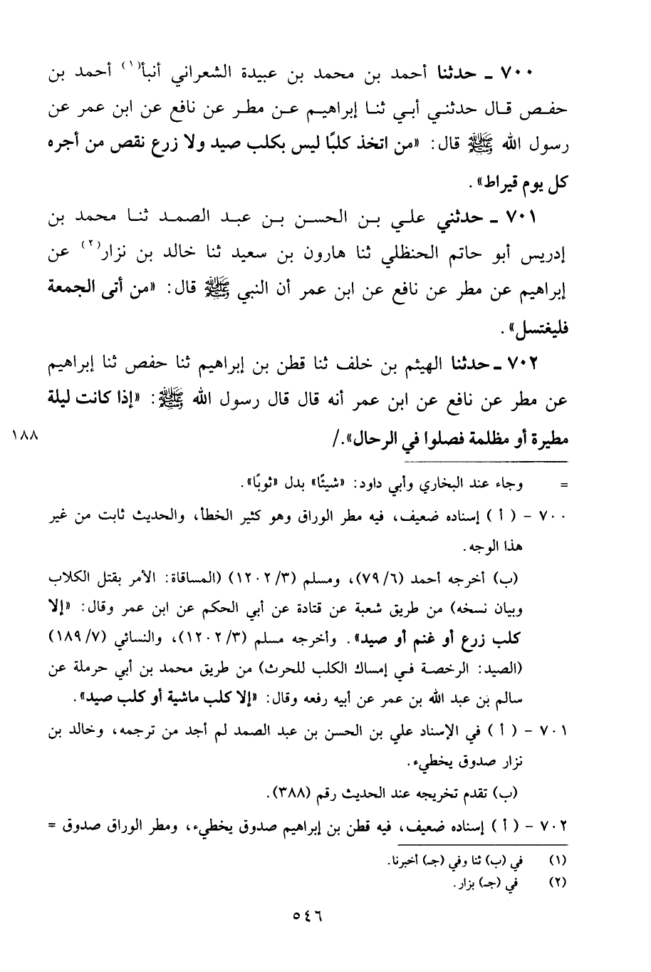 700 - حَدَّثَنَا أَحْمَدُ بْنُ مُحَمَّدِ بْنِ عُبَيْدَةَ الشَّعْرَانِيُّ، أَنْبَأَ أَحْمَدُ بْنُ حَفْصٍ قَالَ: حَدَّثَنِي أَبِي، ثنا إِبْرَاهِيمُ، عَنْ مَطَرٍ، عَنْ نَافِعٍ، عَنِ ابْنِ عُمَرَ، عَنْ رَسُولِ اللَّهِ صَلَّى اللهُ عَلَيْهِ وَسَلَّمَ قَالَ: «مَنِ اتَّخَذَ كَلْبًا لَيْسَ بِكَلْبِ صَيْدٍ وَلَا زَرْعٍ نَقَصَ مِنْ أَجْرِهِ كُلَّ يَوْمٍ قِيرَاطٌ»