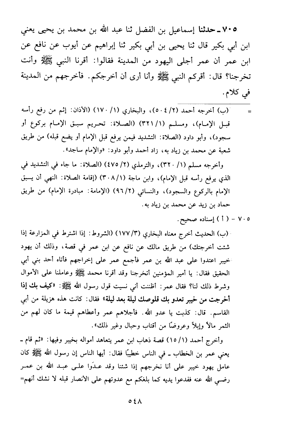 705 - حَدَّثَنَا إِسْمَاعِيلُ بْنُ الْفَضْلِ، ثنا عَبْدُ اللَّهِ بْنُ مُحَمَّدِ بْنِ يَحْيَى يَعْنِي ابْنَ أَبِي بُكَيْرٍ قَالَ: ثنا يَحْيَى بْنُ أَبِي بُكَيْرٍ، ثنا إِبْرَاهِيمُ، عَنْ أَيُّوبَ، عَنْ نَافِعٍ، عَنِ ابْنِ عُمَرَ، أَنَّ عُمَرَ أَجْلَى الْيَهُودَ مِنَ الْمَدِينَةِ، فَقَالُوا: أَقَرَّنَا النَّبِيُّ صَلَّى اللهُ عَلَيْهِ وَسَلَّمَ وَأَنْتَ تُخْرِجُنَا؟ قَالَ: «أَقَرَّكُمُ النَّبِيُّ صَلَّى اللهُ عَلَيْهِ وَسَلَّمَ وَأَنَا أَرَى أَنْ أُخْرِجَكُمْ» فَأَخْرَجَهُمْ مِنَ الْمَدِينَةِ فِي كَلَامٍ