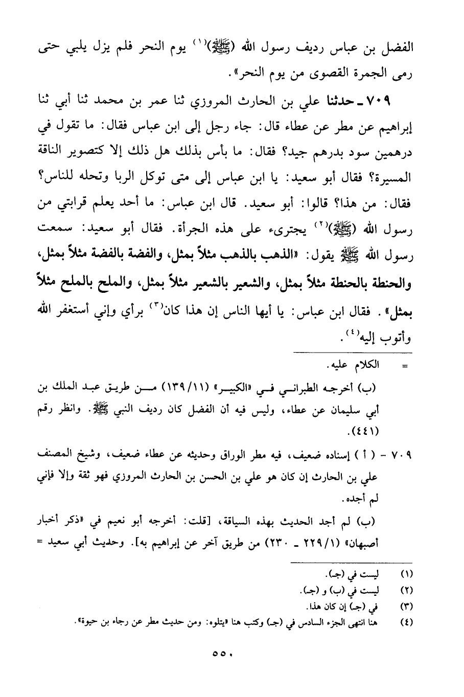 709 - حَدَّثَنَا عَلِيُّ بْنُ الْحَارِثِ الْمَرْوَزِيُّ، ثنا عُمَرُ بْنُ مُحَمَّدٍ، ثنا أَبِي، ثنا إِبْرَاهِيمُ، عَنْ مَطَرٍ، عَنْ عَطَاءٍ قَالَ: جَاءَ رَجُلٌ إِلَى ابْنِ عَبَّاسٍ، فَقَالَ: مَا تَقُولُ فِي دِرْهَمَيْنِ سُودٍ بِدِرْهَمٍ جَيِّدٍ؟ فَقَالَ: مَا بَأْسٌ بِذَلِكَ إِلَّا كَتَصْوِيرِ النَّاقَةِ الْمُسَيَّرَةِ؟، فَقَالَ أَبُو سَعِيدٍ: يَا ابْنَ عَبَّاسٍ إِلَى مَتَى تَوَكِّلُ الرِّبَا وَتُحِلُّهُ لِلنَّاسِ؟ فَقَالَ: مَنْ هَذَا؟ قَالُوا: أَبُو سَعِيدٍ. قَالَ ابْنُ عَبَّاسٍ: مَا أَحَدٌ يَعْلَمُ قَرَابَتِي مِنْ رَسُولِ اللَّهِ صَلَّى اللهُ عَلَيْهِ وَسَلَّمَ يَجْتَرِئُ عَلَيَّ هَذِهِ الْجُرْأَةَ، فَقَالَ أَبُو سَعِيدٍ: سَمِعْتُ رَسُولَ اللَّهِ صَلَّى اللهُ عَلَيْهِ وَسَلَّمَ يَقُولُ: «الذَّهَبُ بِالذَّهَبِ مِثْلًا بِمِثْلٍ، وَالْفِضَّةُ بِالْفِضَّةِ مِثْلًا بِمِثْلٍ، وَالْحِنْطَةُ بِالْحِنْطَةِ مِثْلًا بِمِثْلٍ، وَالشَّعِيرُ بِالشَّعِيرِ مِثْلًا بِمِثْلٍ، وَالْمِلْحُ بِالْمِلْحِ مِثْلًا بِمِثْلٍ» فَقَالَ ابْنُ عَبَّاسٍ: يَا أَيُّهَا النَّاسُ إِنَّ هَذَا كَانَ بِرَأْيٍ وَإِنِّي أَسْتَغْفِرُ اللَّهَ وَأَتُوبُ إِلَيْهِ