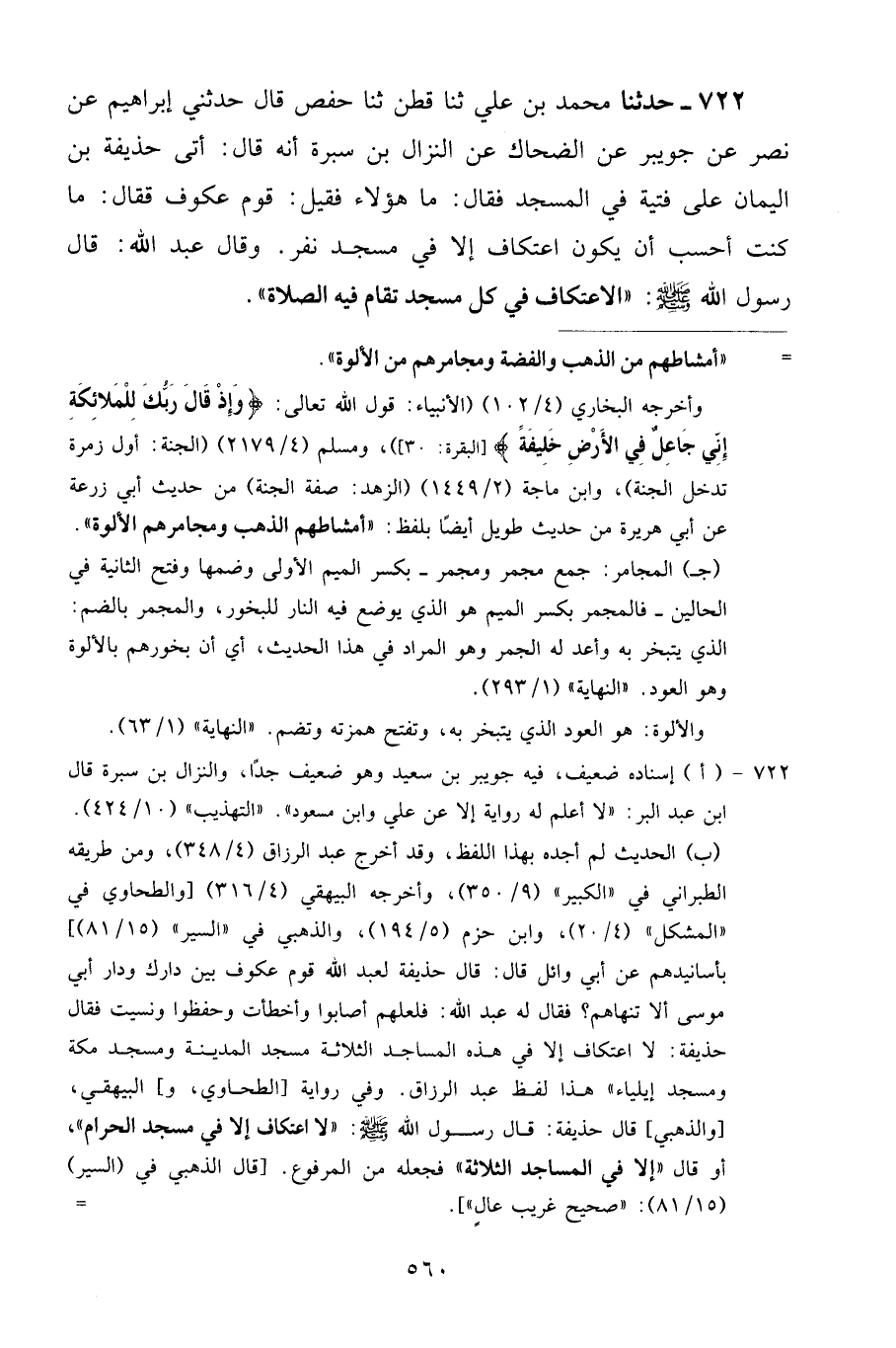 722 - حَدَّثَنَا مُحَمَّدُ بْنُ عَلِيٍّ، ثنا قَطَنٌ، ثنا حَفْصٌ قَالَ: حَدَّثَنِي إِبْرَاهِيمُ، عَنْ نَصْرٍ، عَنْ جُوَيْبِرٍ، عَنِ الضَّحَّاكِ، عَنِ النَّزَّالِ بْنِ سَبْرَةَ، أَنَّهُ قَالَ: أَتَى حُذَيْفَةُ بْنُ الْيَمَانِ عَلَى فِتْيَةٍ فِي الْمَسْجِدِ فَقَالَ: مَا هَؤُلَاءِ؟ فَقِيلَ: قَوْمٌ عُكُوفٌ، فَقَالَ: مَا كُنْتُ أَحْسَبُ أَنْ يَكُونَ اعْتِكَافٌ إِلَّا فِي مَسْجِدِ نَفْرٍ، وَقَالَ عَبْدُ اللَّهِ: قَالَ رَسُولُ اللَّهِ صَلَّى اللهُ عَلَيْهِ وَسَلَّمَ: «الِاعْتِكَافُ فِي كُلِّ مَسْجِدٍ تُقَامُ فِيهِ الصَّلَاةُ»