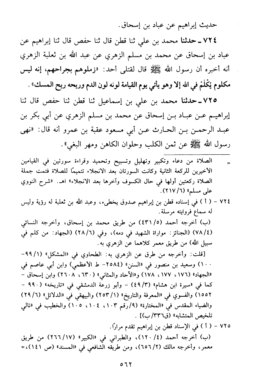 724 - حَدَّثَنَا مُحَمَّدُ بْنُ عَلِيٍّ، ثنا قَطَنٌ قَالَ: ثنا حَفْصٌ قَالَ: ثنا إِبْرَاهِيمُ، عَنْ عَبَّادِ بْنِ إِسْحَاقَ، عَنْ مُحَمَّدِ بْنِ مُسْلِمٍ الزُّهْرِيِّ، عَنْ عَبْدِ اللَّهِ بْنِ ثَعْلَبَةَ الزُّهْرِيِّ، أَنَّهُ أَخْبَرَهُ أَنَّ رَسُولَ اللَّهِ صَلَّى اللهُ عَلَيْهِ وَسَلَّمَ قَالَ لِقَتْلَى أُحُدٍ: «زَمِّلُوهُمْ بِجِرَاحِهِمْ، إِنَّهُ لَيْسَ مَكْلُومٌ يُكْلَمُ فِي اللَّهِ إِلَّا وَهُوَ يَأْتِي يَوْمَ الْقِيَامَةِ لَوْنُهُ لَوْنُ الدَّمِ وَرِيحُهُ رِيحُ الْمِسْكِ»