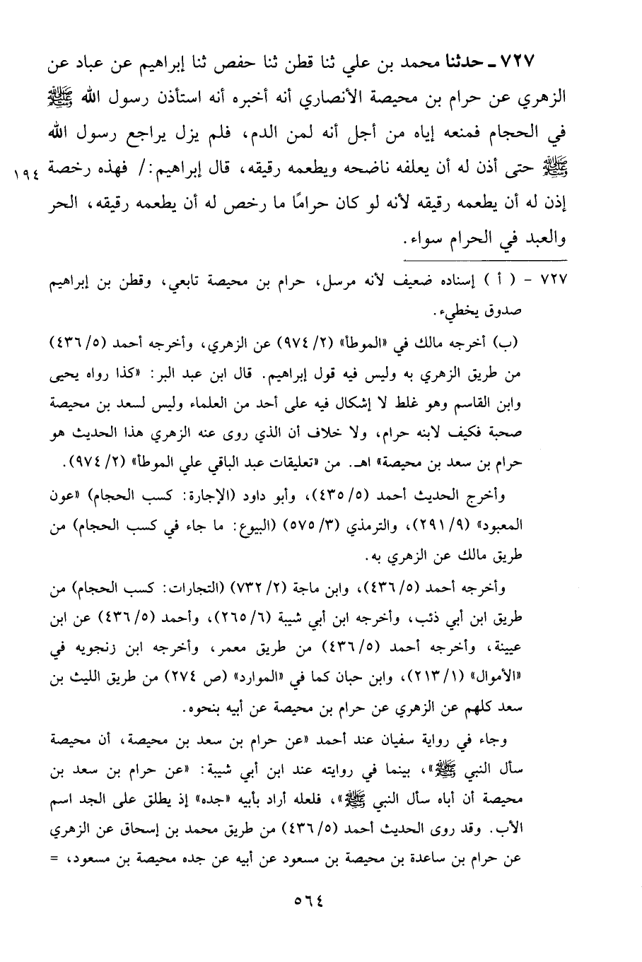 727 - حَدَّثَنَا مُحَمَّدُ بْنُ عَلِيٍّ، ثنا قَطَنٌ، ثنا حَفْصٌ، ثنا إِبْرَاهِيمُ، عَنْ عَبَّادٍ، عَنِ الزُّهْرِيِّ، عَنْ حَرَامِ بْنِ مُحَيِّصَةَ الْأَنْصَارِيِّ أَنَّهُ أَخْبَرَهُ أَنَّهُ اسْتَأْذَنَ رَسُولَ اللَّهِ صَلَّى اللهُ عَلَيْهِ وَسَلَّمَ فِي الْحَجَّامِ فَمَنَعَهُ إِيَّاهُ مِنْ أَجْلِ أَنَّهُ لَمِنَ الدَّمِ، فَلَمْ يَزَلْ يُرَاجِعُ رَسُولَ اللَّهِ صَلَّى اللهُ عَلَيْهِ وَسَلَّمَ حَتَّى أَذِنَ أَنْ يَعْلِفَهُ نَاضِحَهُ وَيُطْعِمَهُ رَقِيقَهُ " قَالَ إِبْرَاهِيمُ: فَهَذِهِ رُخْصَةٌ أَذِنَ لَهُ أَنْ يُطْعِمَهُ رَقِيقَهُ؛ لِأَنَّهُ لَوْ كَانَ حَرَامًا مَا رَخَّصَ لَهُ أَنْ يُطْعِمَهُ رَقِيقَهُ، الْحَرُّ وَالْعَبْدُ فِي الْحَرَامُ سَوَاءٌ